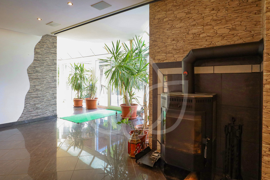 - EG mit HWR, Gäste-WC, Küche und Wohnbereich mit integriertem Wintergarten, Kamin und Terrasse