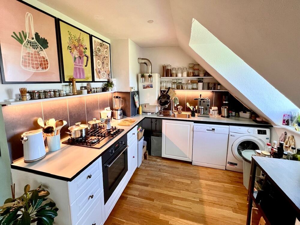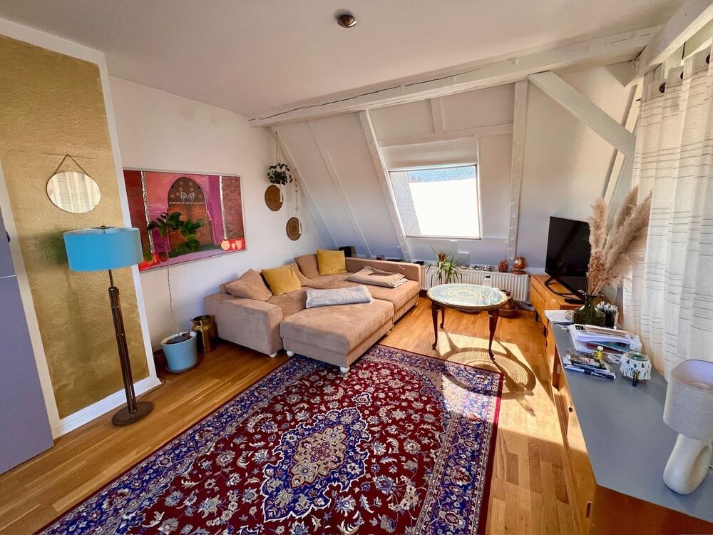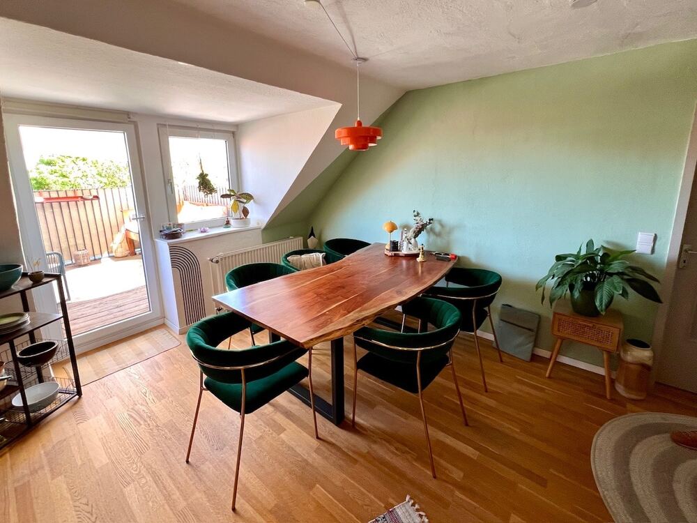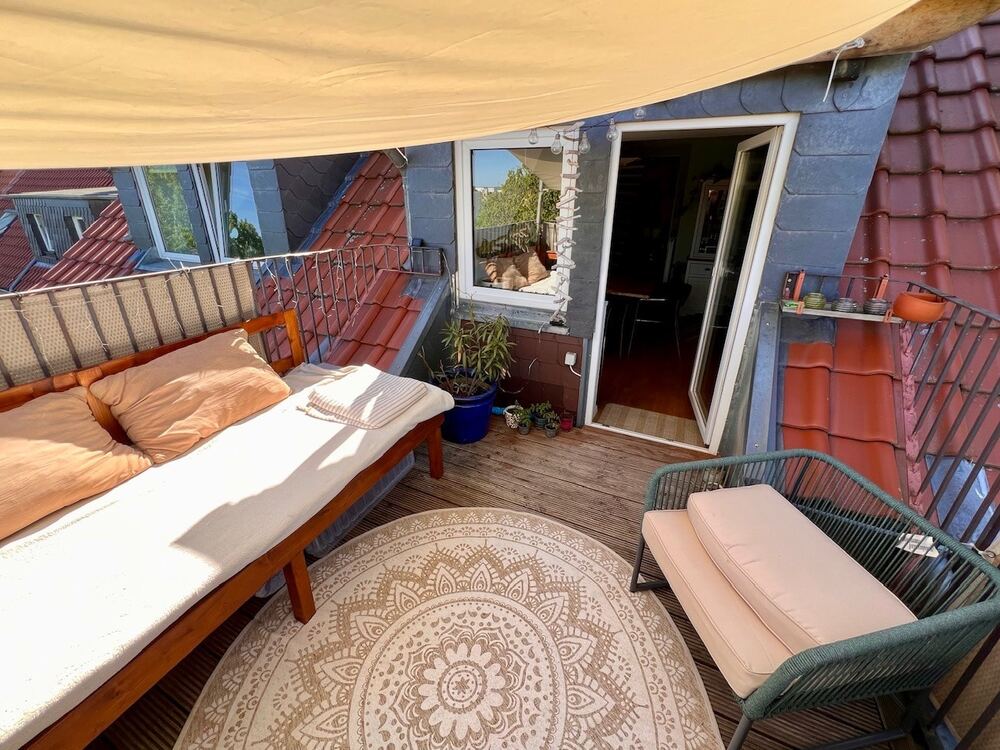 Auf zwei Ebenen im 4. Ober- und Dachgeschoss (Ausbau in den 80er Jahren) gelegen, bietet sie Ihnen insgesamt ca. 114 m² Wohnfläche. Diese Flächen verteilen sich sich auf die Maisonette mit Wohn- und Arbeitsbereich und kleinem Abstellraum, den Essbereich mit offener Küche, das Schlafzimmer, das Bad mit Dusche und Wanne und die Dachterrasse.