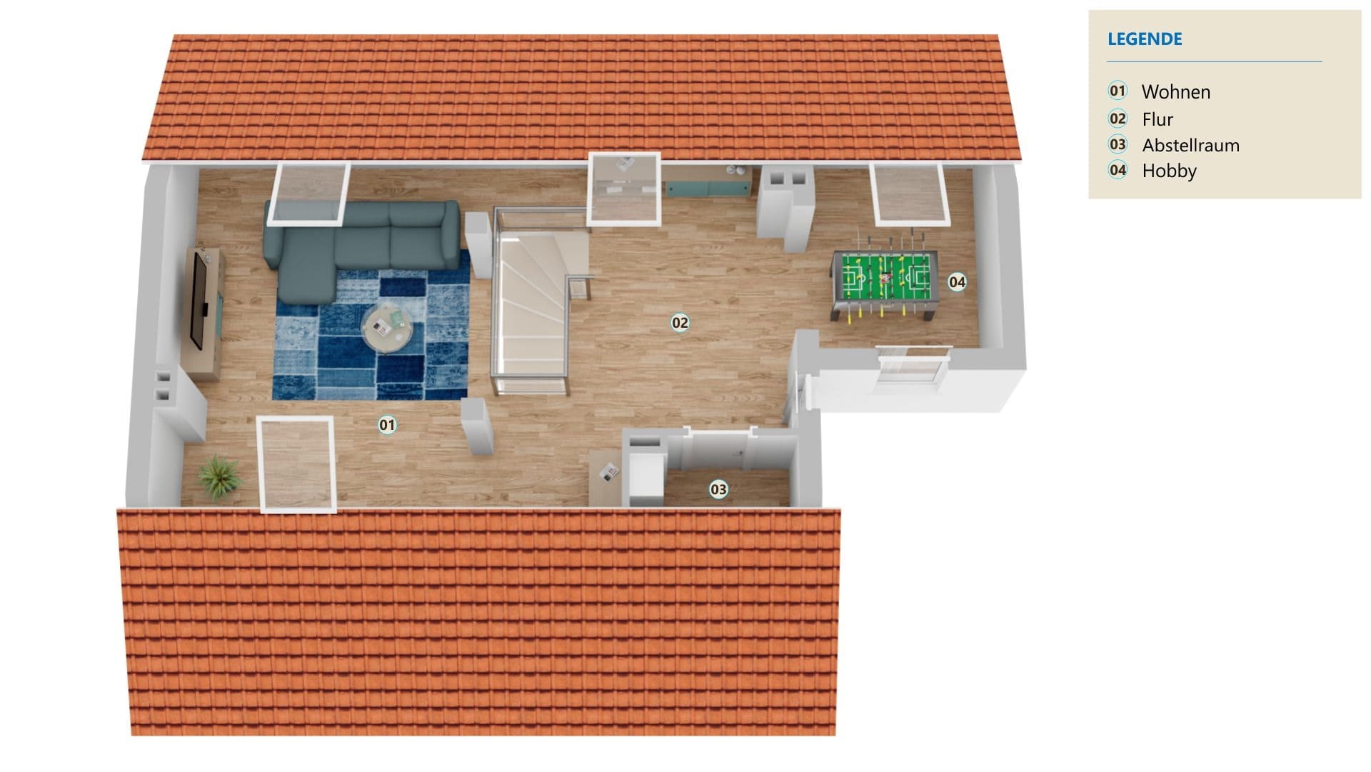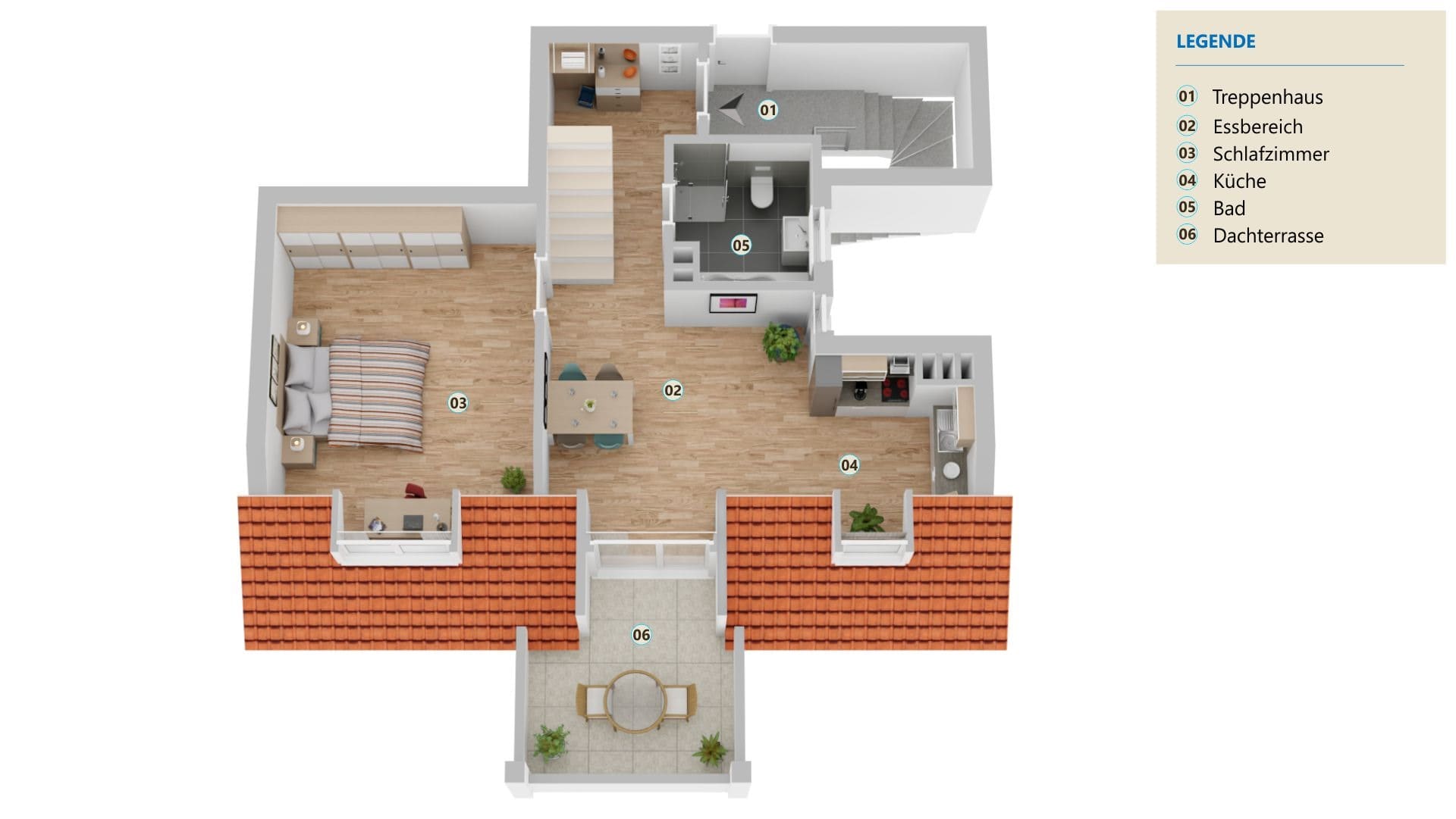 4.OG: Essbereich, offene Küche, Schlafzimmer, Bad mit Dusche und Wanne, Dachterrasse DG: Maisonette mit Wohn- und Arbeitsbereich, Abstellraum