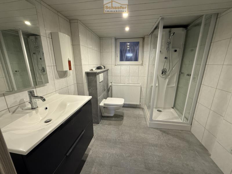 Bad: Ein modernes Bad mit Dusche.