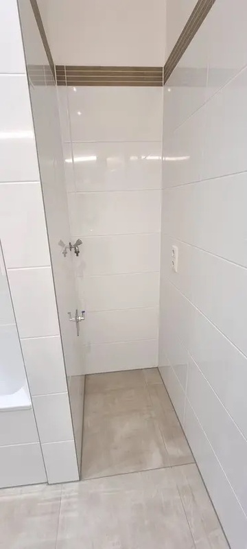 Badewanne, 2 Waschtische mit eleganten Unterschränken zum Herausziehen, Großflächenspiegel, gemauerte Ablage, Toilette, gemauerte Nische für Waschmaschine und Trockner, Wäschewärmerheizkörper. Fliesen: hochglänzend weiß mit Bordüre in taupe. Bodenbelag: Fliesen/taupe. Toilette, Waschtisch mit elegantem Unterschrank zum Herausziehen, Großflächenspiegel, gemauerte Ablage. Fliesen: hochglänzend weiß mit Bordüre in taupe