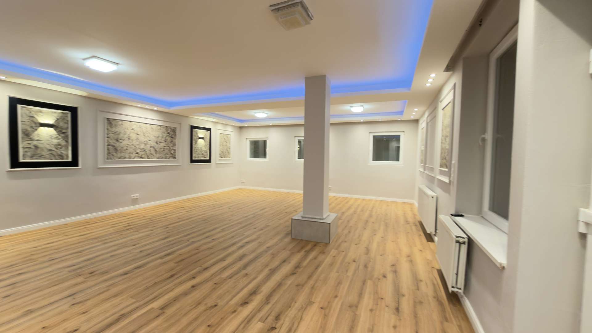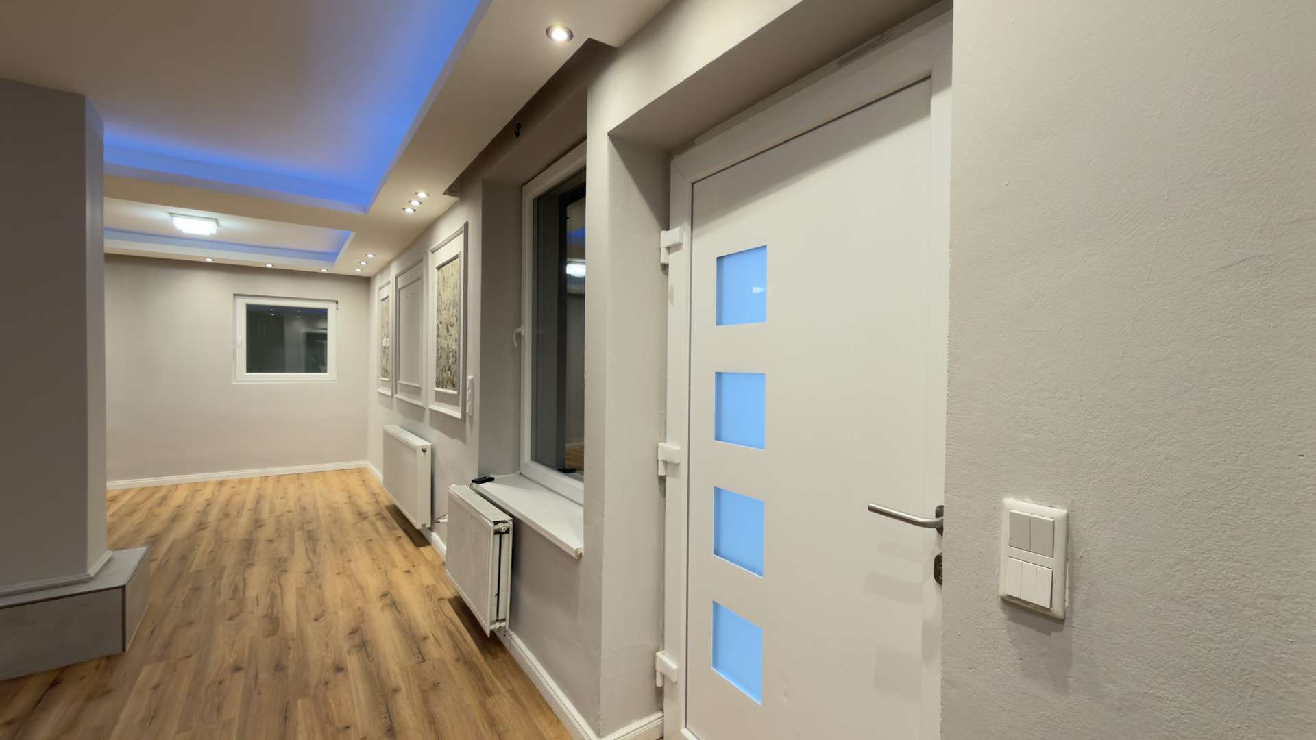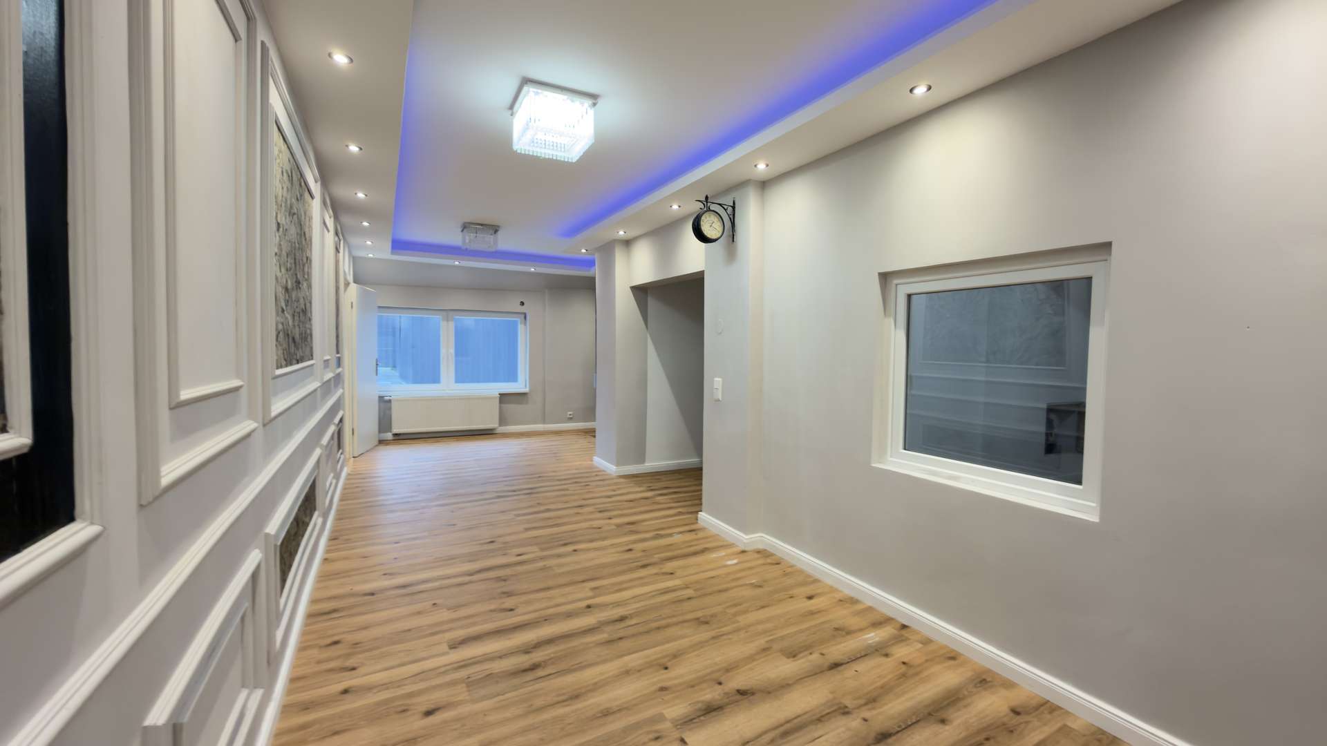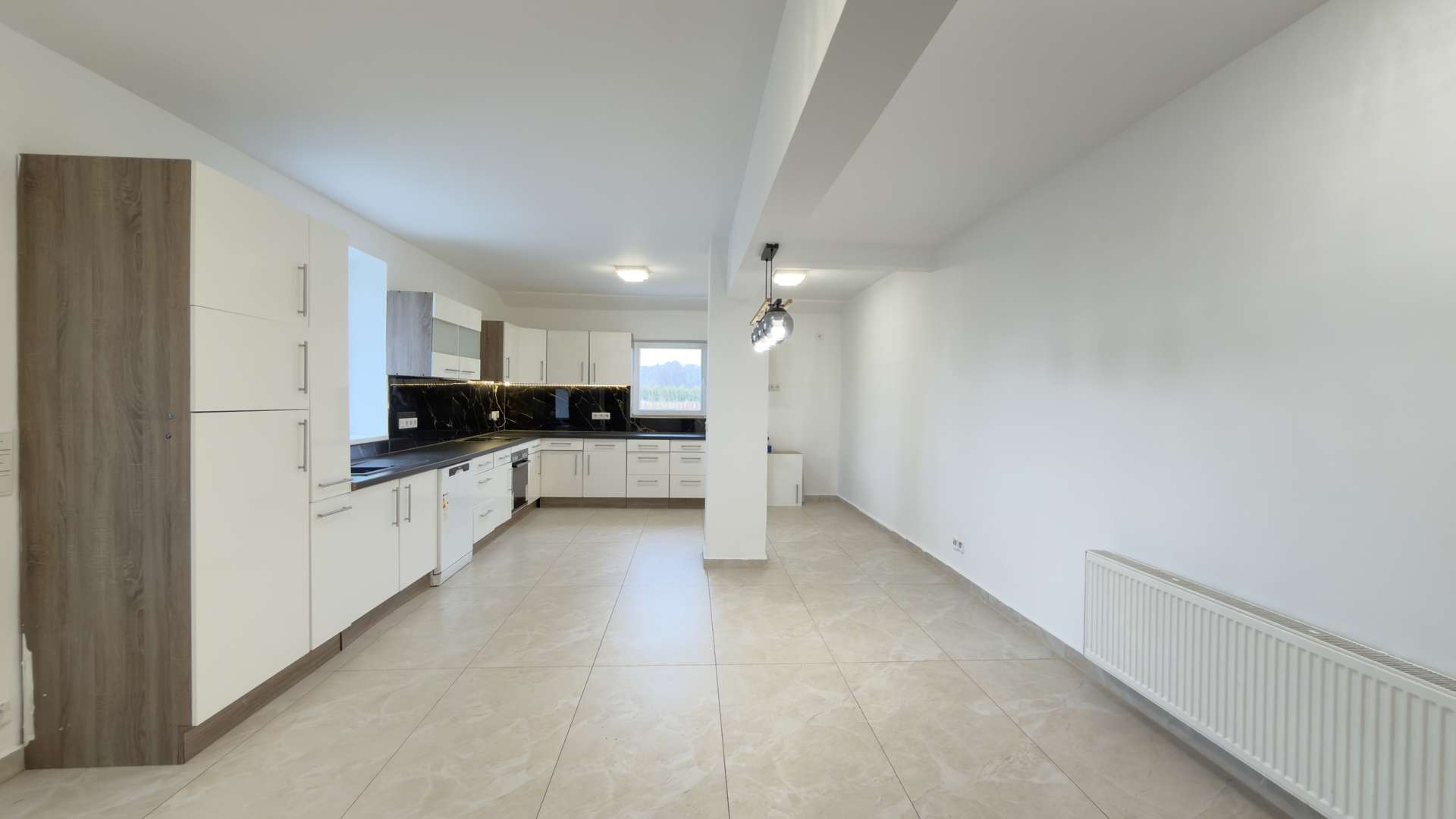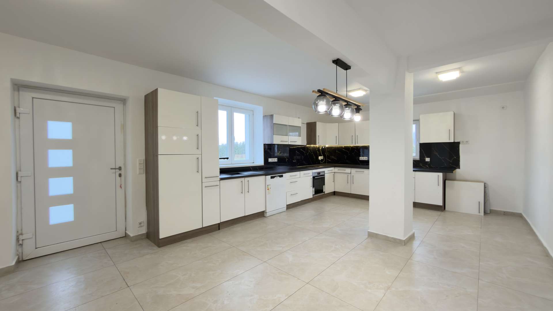 Das sehr großzügige Wohnzimmer empfängt Sie unmittelbar nach Betreten des Hauses. Hochwertige Bodenfliesen, dekorative Wandfliesen sowie integrierte LED-Beleuchtung verleihen dem Raum eine repräsentative und moderne Atmosphäre. Linker Hand öffnet sich ein außergewöhnlich breiter Flur mit dekorativen Wandpaneelen und eleganten Gestaltungselementen, der dem Erdgeschoss eine nahezu palastartige Großzügigkeit verleiht. Von hier aus sind sämtliche Räume optimal erschlossen. Die sehr großzügige Küche überzeugt nicht nur durch ihre Dimension, sondern auch durch ihre Funktionalität. Von hier aus besteht ein direkter Zugang zur Terrasse und in den weitläufigen Garten. Zusätzlich befindet sich im seitlichen Bereich des Hauses ein weiterer direkter Ausgang ins Freie.