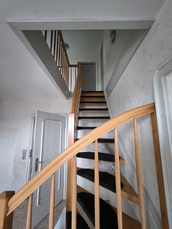 Eine elegante Holztreppe führt ins Dachgeschoss, wo zwei geräumige Schlafzimmer