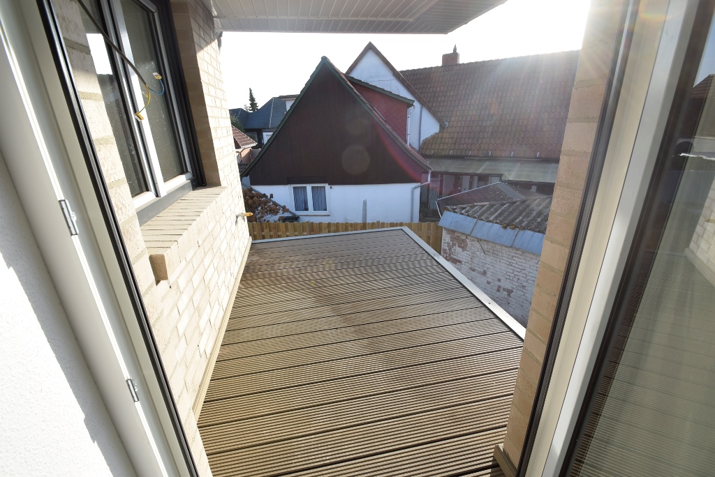 • Blick auf den Balkon, der noch mit einem Geländer ausgestattet wird -