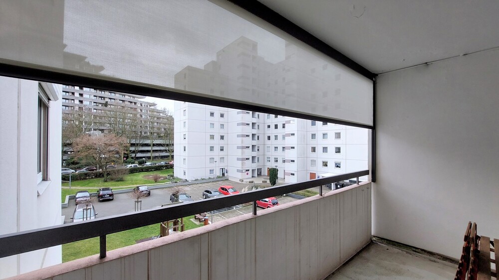 Von dort gelangen Sie direkt in den lichtdurchfluteten, durch einen Raumteiler in zwei Bereiche aufgeteilten, Wohn-/Schlafraum mit Zugang zum großen Süd-Balkon. Ein modernes Markisen-Rollo bietet Schutz vor Sonne und garantiert Ihre Privatsphäre.