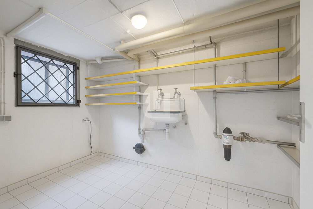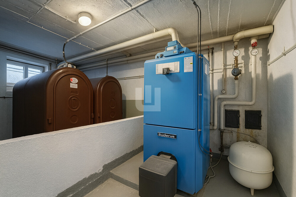Das Kellergeschoss bietet mehrere praktische Nutzräume, darunter ein großer Hobbyraum sowie Bereiche für Vorräte und Haustechnik. Die Ölheizung stammt aus dem Jahr 2005, die Elektrik entspricht dem Baujahr des Hauses.