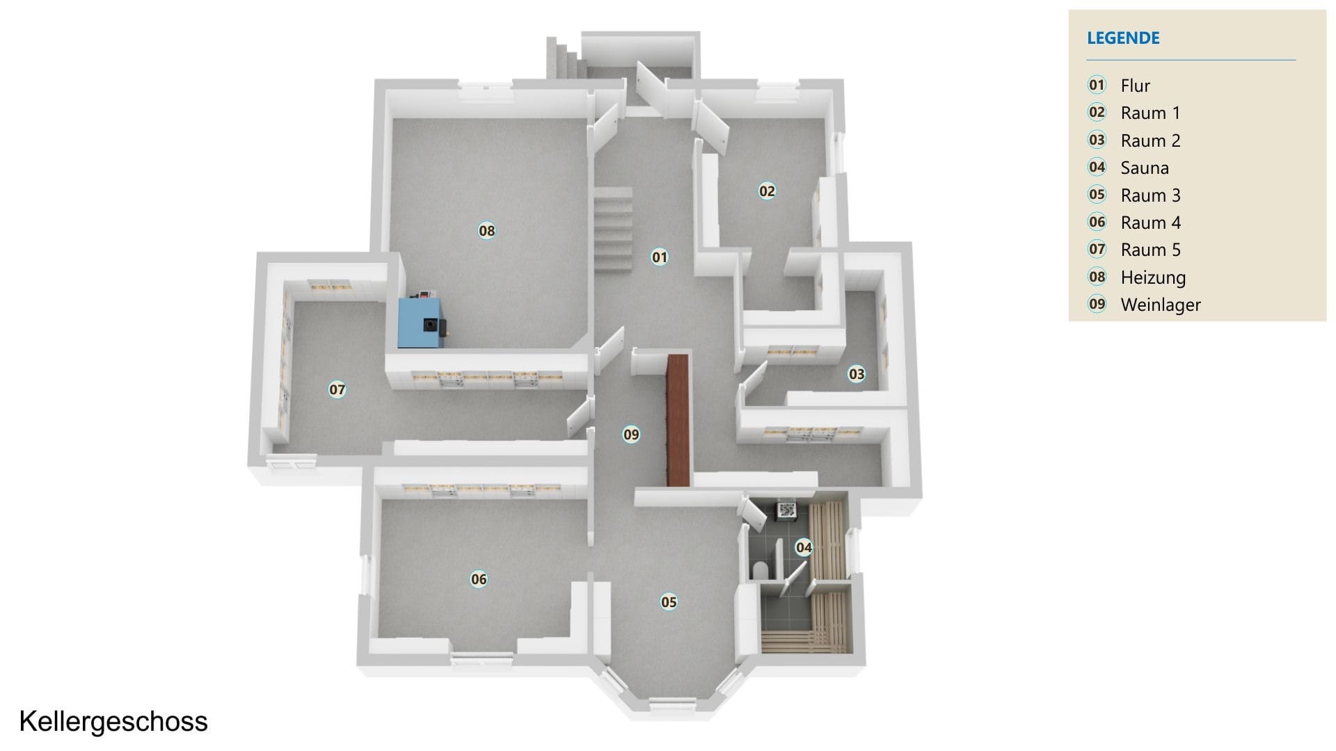 Zusätzliche Nutzflächen, z.B. für Ihre Hobbies, finden Sie im Vollkeller. Hier ist auch eine Sauna installiert.
