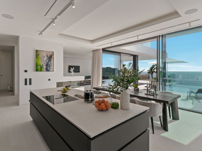 Die moderne Villa hat eine Wohnfläche von 691m2 am Berghang mit spektakulärem Meerblick. Dank der Südwestausrichtung genießt das Anwesen den ganzen Tag über natürliches Licht und unglaubliche Sonnenuntergänge.