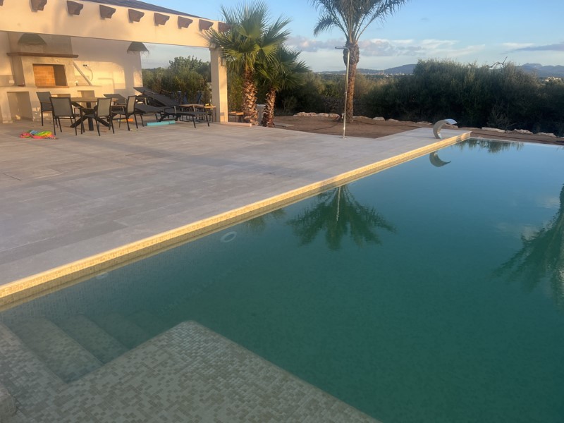 Der Außenbereich ist geprägt von der charakteristischen mallorquinischen Vegetation und dem angelegten Garten mit einer Palmenallee. Das Hauptmerkmal ist der beeindruckende 15 m lange Infinity-Pool, der beheizt ist und von einer Liegewiese begleitet wird.
