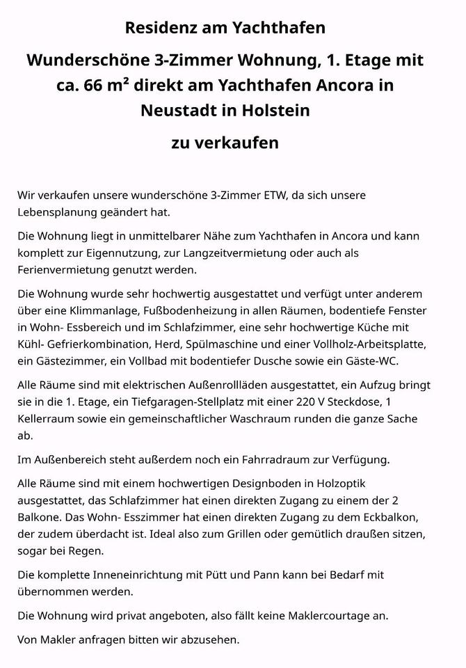 Sie befinden sich hier: 3 Zi.Wohnung Neustadt in Holstein Ancora Yachthafen Privat in Neustadt in Holstein - 3329526238-196-13579 | 1A-Immobilienmarkt.de