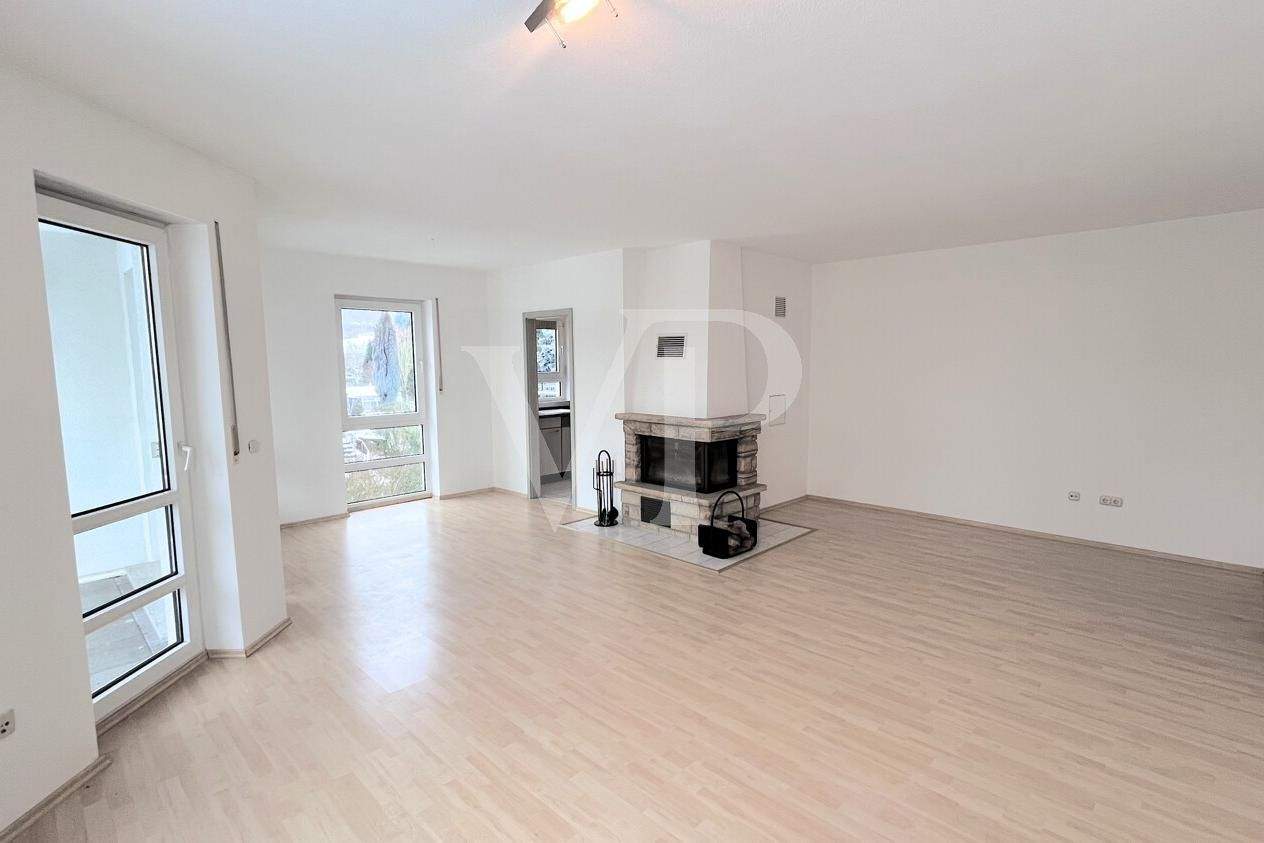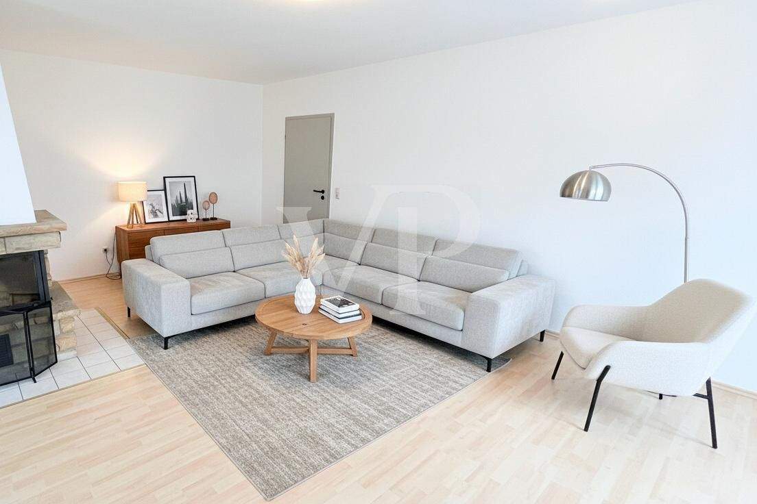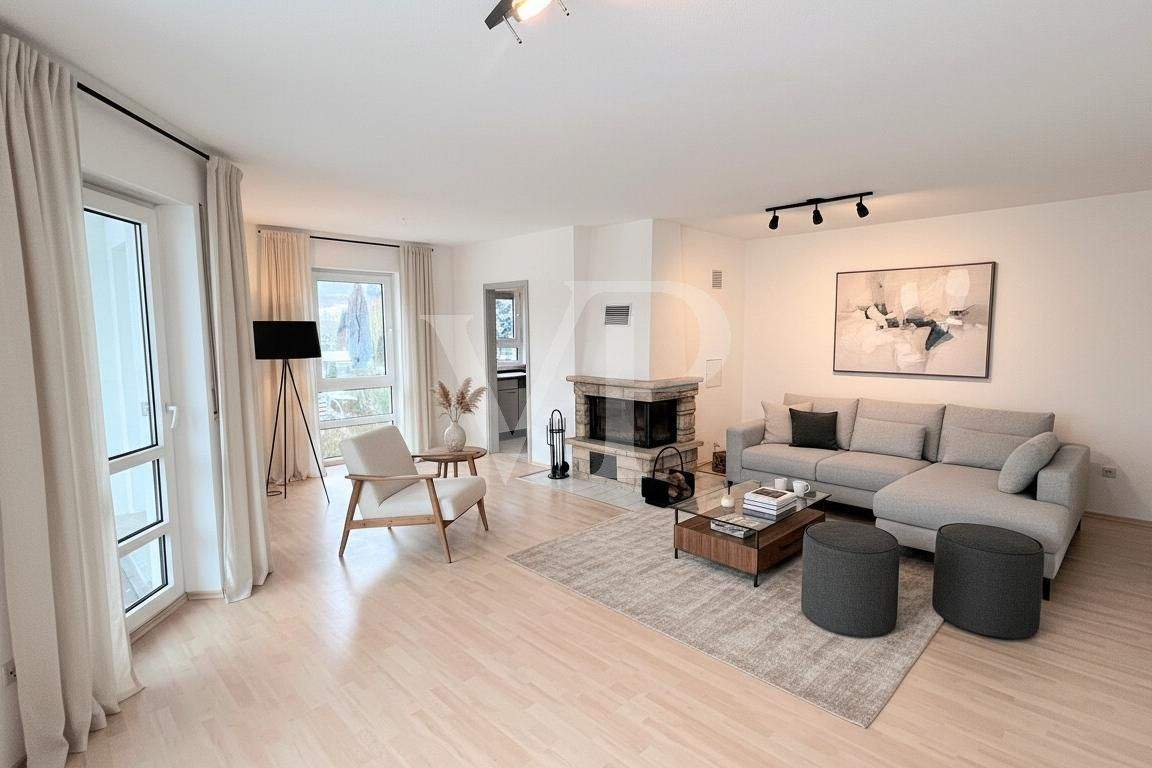 Helles, einladendes Wohnzimmer - Gut geschnittene, helle Zweizimmerwohnung mit Kamin, großem Balkon und Tiefgaragenstellplatz