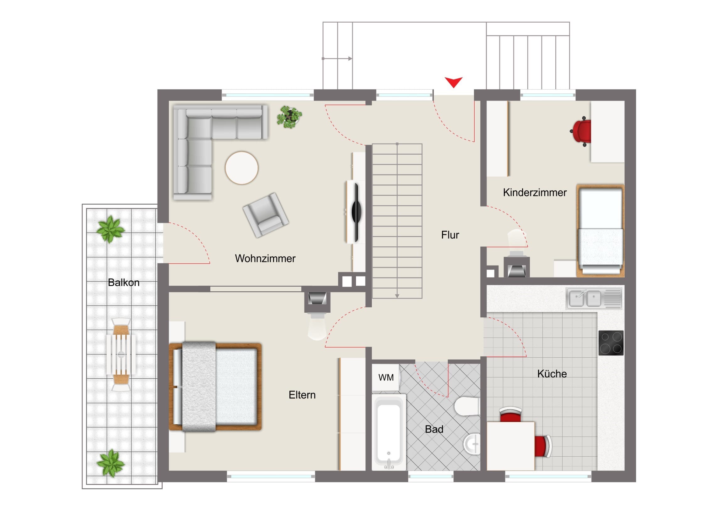 Beim Betreten des Hauses gelangt man in einen zentralen Flur, von dem aus alle Räume des Erdgeschosses erreichbar sind. Auf dieser Ebene befinden sich eine Küche, ein Kinderzimmer, ein Tageslichtbad mit Wanne sowie ein Wohnzimmer und ein Schlafzimmer. Das Wohnzimmer und das Schlafzimmer sind derzeit durch einen Torbogen miteinander verbunden.. Diese Raumgestaltung bietet die Möglichkeit, den offenen Charakter beizubehalten oder die Räume wieder in zwei separate Zimmer zu unterteilen. Vom Wohnzimmer aus besteht zudem Zugang zum Balkon.