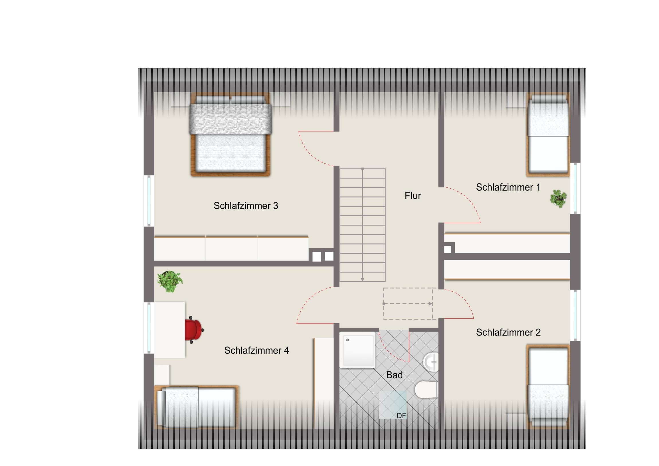 Im Obergeschoss stehen Ihnen vier weitere Räume zur Verfügung, die sich flexibel als Schlafzimmer, Kinderzimmer, Gästezimmer oder Arbeitszimmer nutzen lassen. Das Tageslichtbad mit Dusche rundet die Ebene ab.