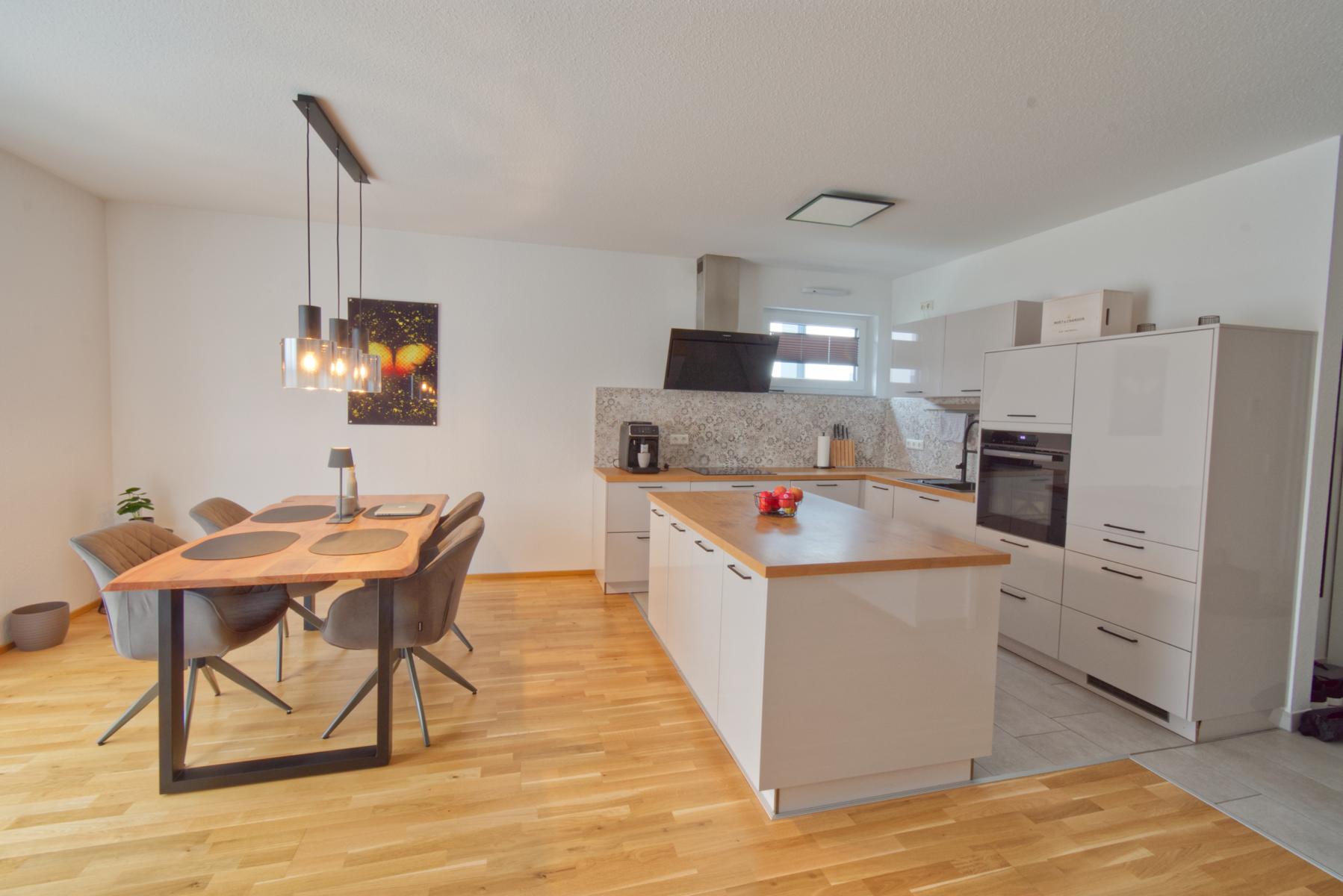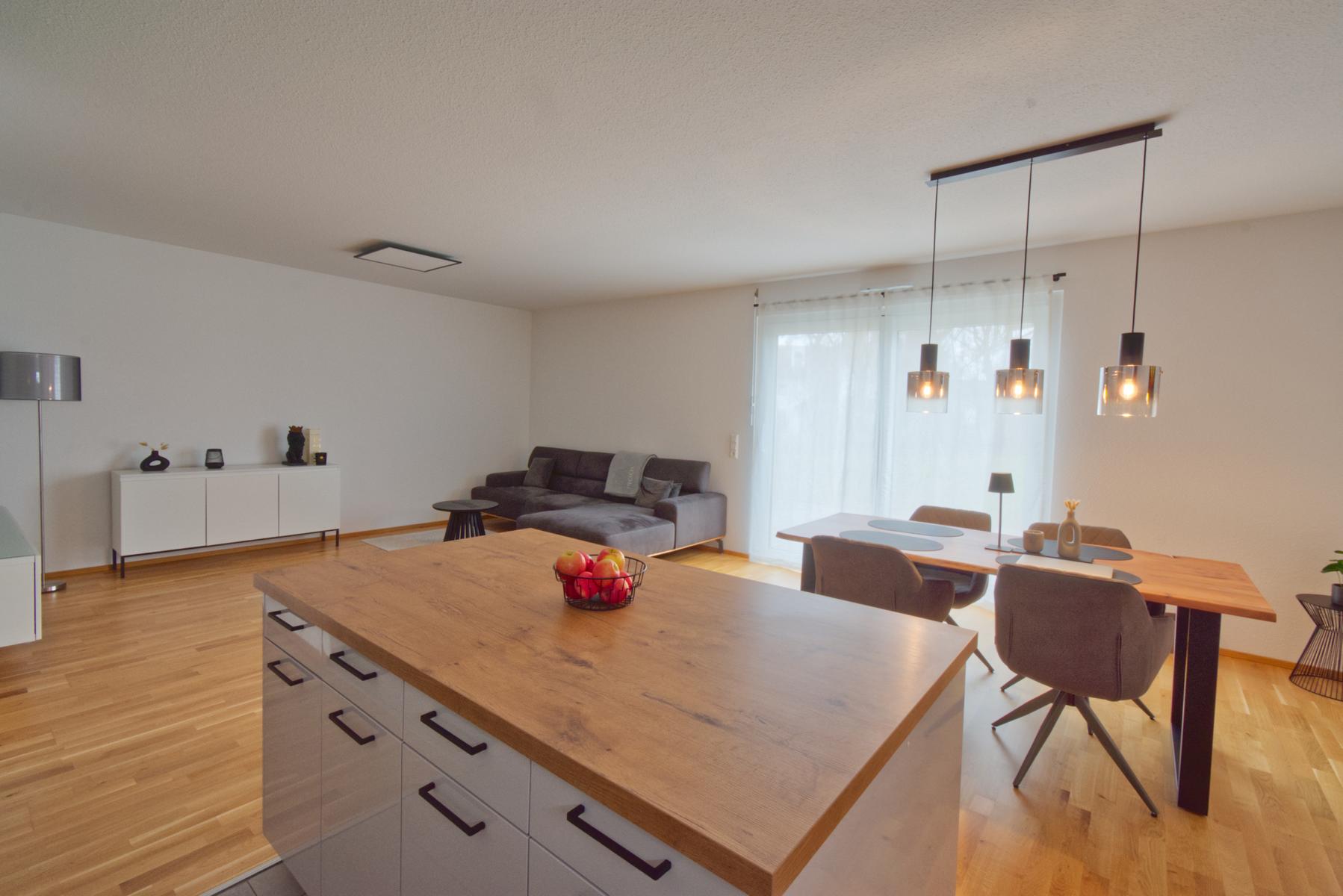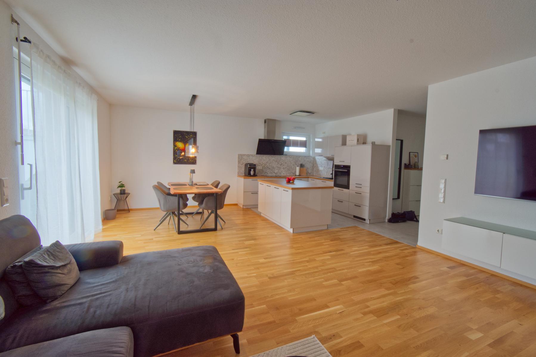 Der großzügige, offen gestaltete Wohn-/Essbereich mit moderner Einbauküche und Kochinsel bildet das Herzstück der Wohnung. Bodentiefe Fenster sorgen für ein helles Wohnambiente. Von der sonnigen Südwest-Terrasse mit kleinem Gartenanteil genießen Sie entspannte Abendstunden mit Blick auf den Sonnenuntergang.