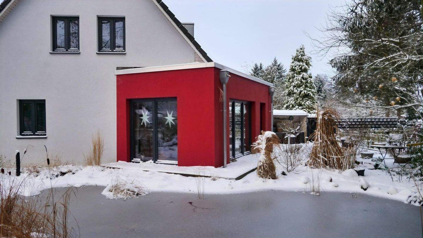 • Winterfoto Giebelansicht mit Teich -