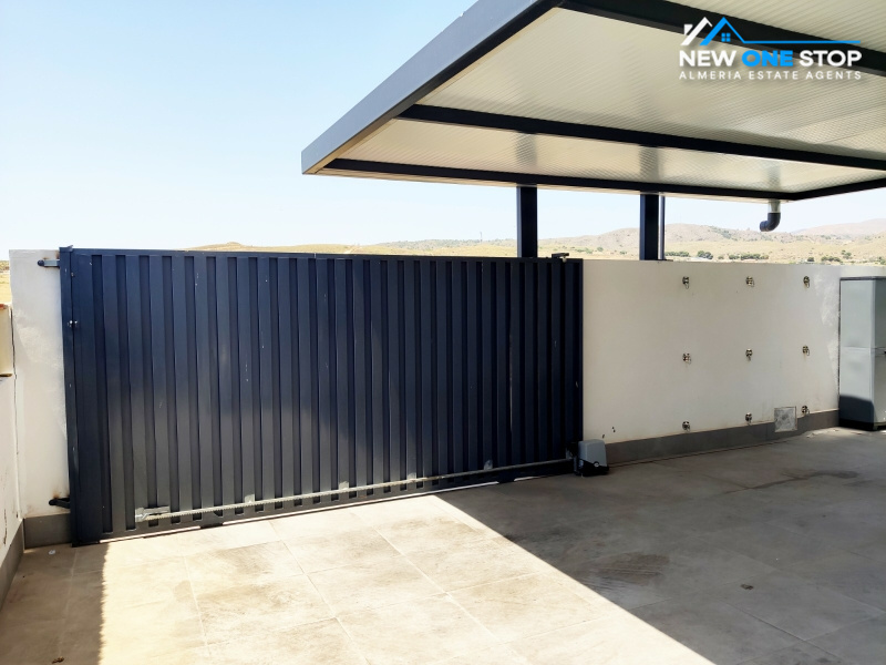 Der Eingang zum Grundstück hat 2 Tore, ein Fußgängertor und ein Schiebetor für Fahrzeuge, das zu einem großen, überdachten Parkplatz für 2 Autos führt, der beide vor der heißen Sommersonne geschützt ist.