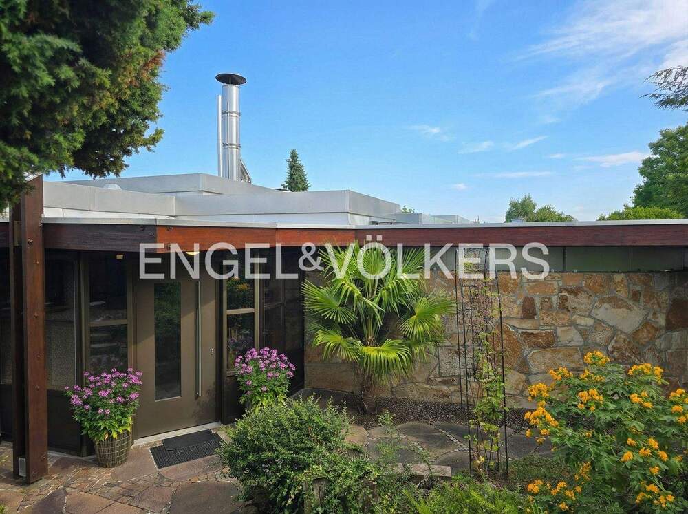 • Außenansicht vom Haus aus dem Garten - Wohnen in Ruhe und Grün . Gepflegter Bungalow mit flexibler Einteilung in ein bis drei Wohneinheiten