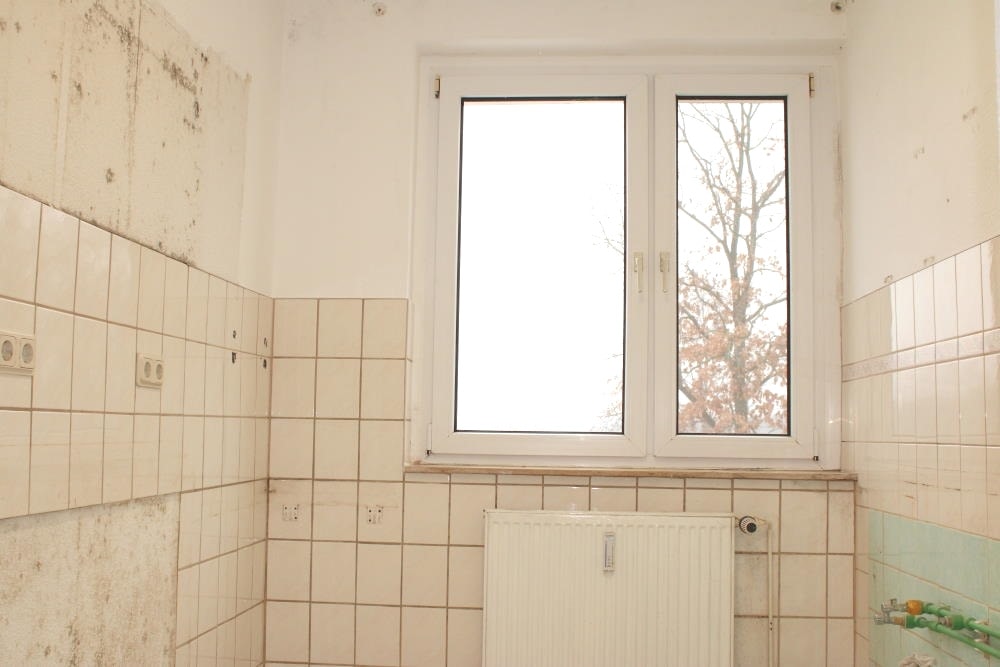 Die Küche mit Fenster und sinnvoll angeordnetem Wasseranschluss bietet genügend Raum für eine Küchenzeile sowie einen Tisch mit Stühlen für gemeinsames Essen.