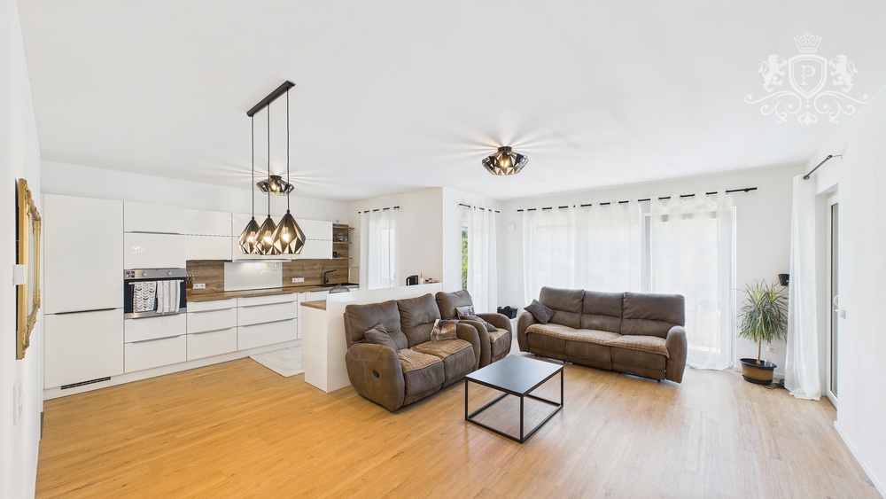 Der großzügige Wohn- und Essbereich mit offener Küche bildet das Herzstück des Hauses. Von hier aus gelangt man direkt auf die Terrasse mit Blick ins Grüne – ideal zum Entspannen, für Familienzeit oder gesellige Abende. Die hochwertige Einbauküche ist modern gestaltet und funktional ausgestattet.