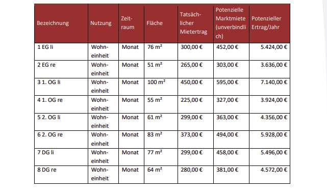 - Jahresnettokaltmiete in Höhe von 29.892, 00 EUR - Vollvermietet - Die derzeitigen Mieten sind aktuell noch weit unter dem Mietpreisspiegel