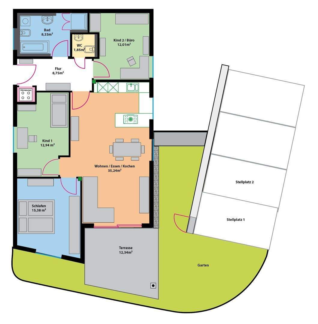 • Aussenansicht und Stellplätze -