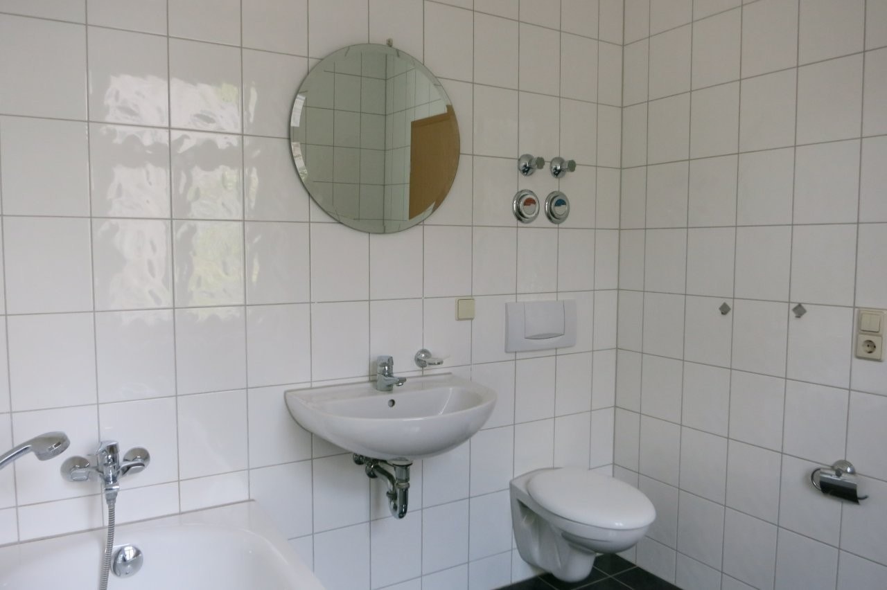 Das große geflieste Bad bietet neben einer Badewanne auch Platz für diverse Badezimmermöbel.