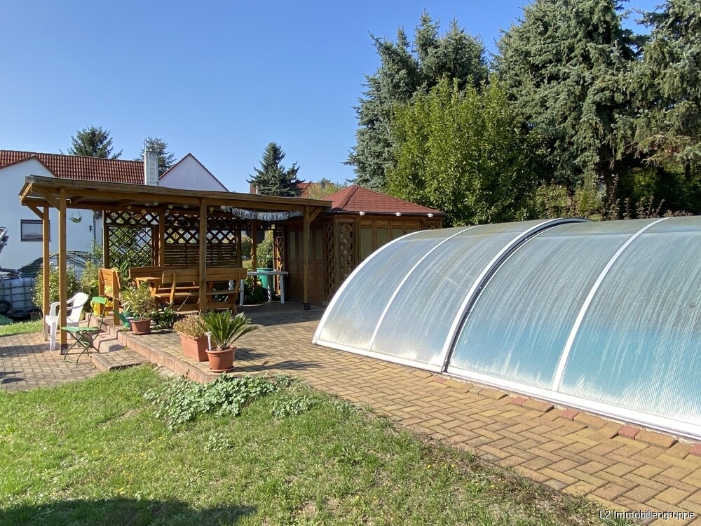 Grundstück: - traumhaft schön angelegt mit einer Fläche von ca. 4338 m², davon sind 400 m²verpachtet zu 300, 00EUR/Jahr und 90 m² zu 75, 00EUR/Jahr - 32 m² großer Außenpool m. Überdachung - Gartenlaube mit Sonnenterrasse