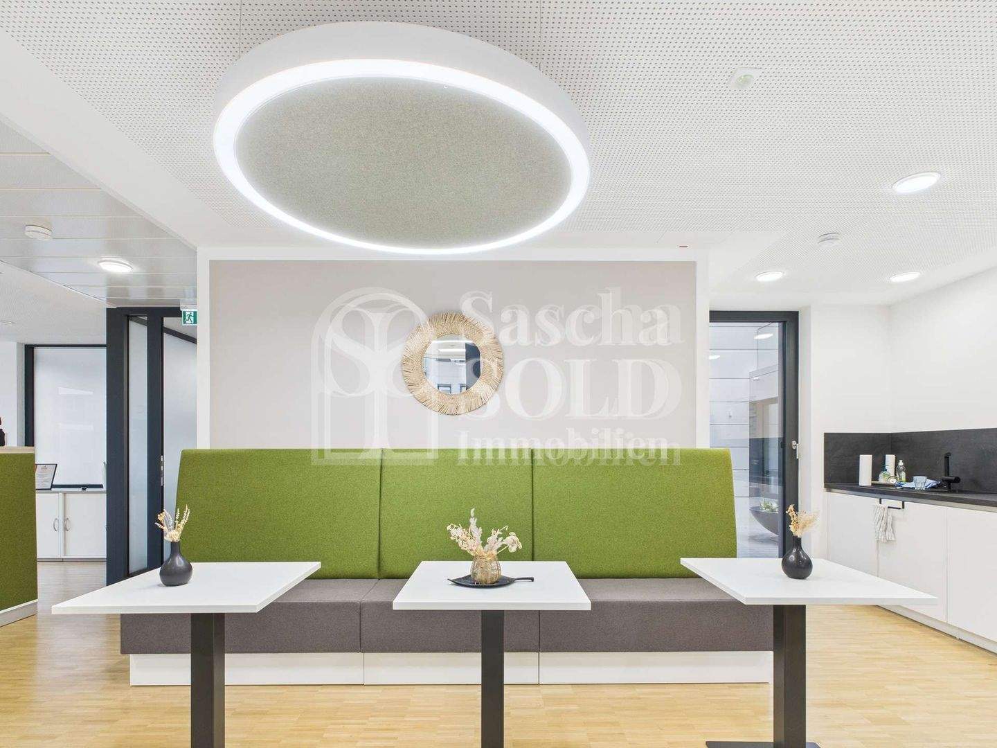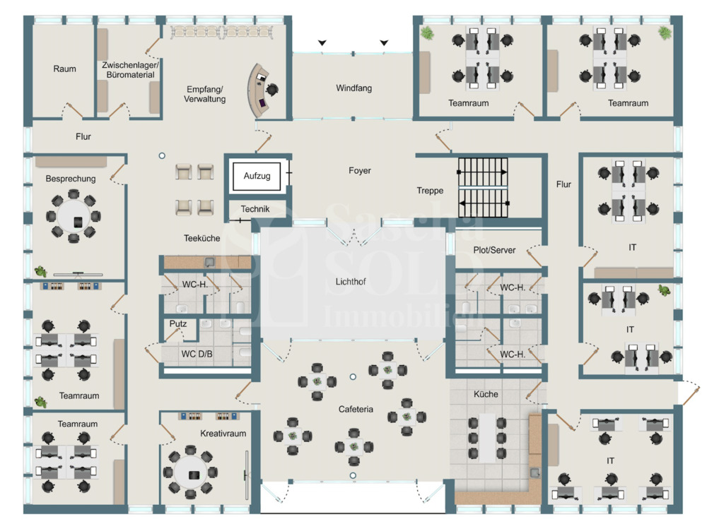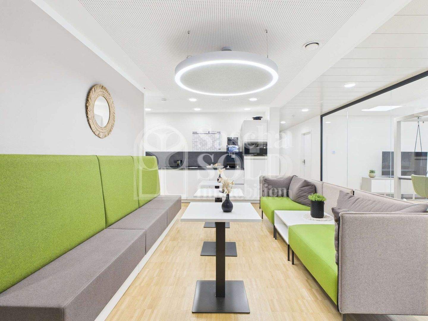 Im Erdgeschoss mit ca. 627 m² schafft das lichtdurchflutete Atrium im Eingangsbereich eine helle, einladende und repräsentative Atmosphäre. Hier befinden sich mehrere großzügige Büroräume sowie ein modern gestalteter Pausenbereich mit großer, voll ausgestatteter Küche als zentraler Treffpunkt für Mitarbeitende. Zusätzlich steht ein großzügiger Raum zur Verfügung, der sich flexibel als Besprechungs-, Schulungs- oder Tagungsraum nutzen lässt und somit auch für größere Teams oder externe Veranstaltungen ideale Voraussetzungen bietet. Die sanitären Anlagen sind getrennt für Damen und Herren ausgestattet.