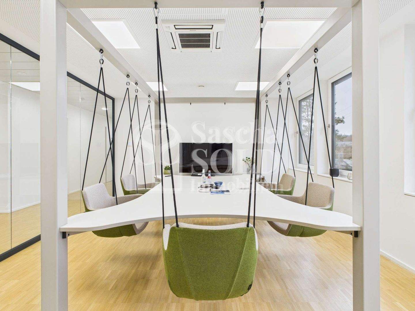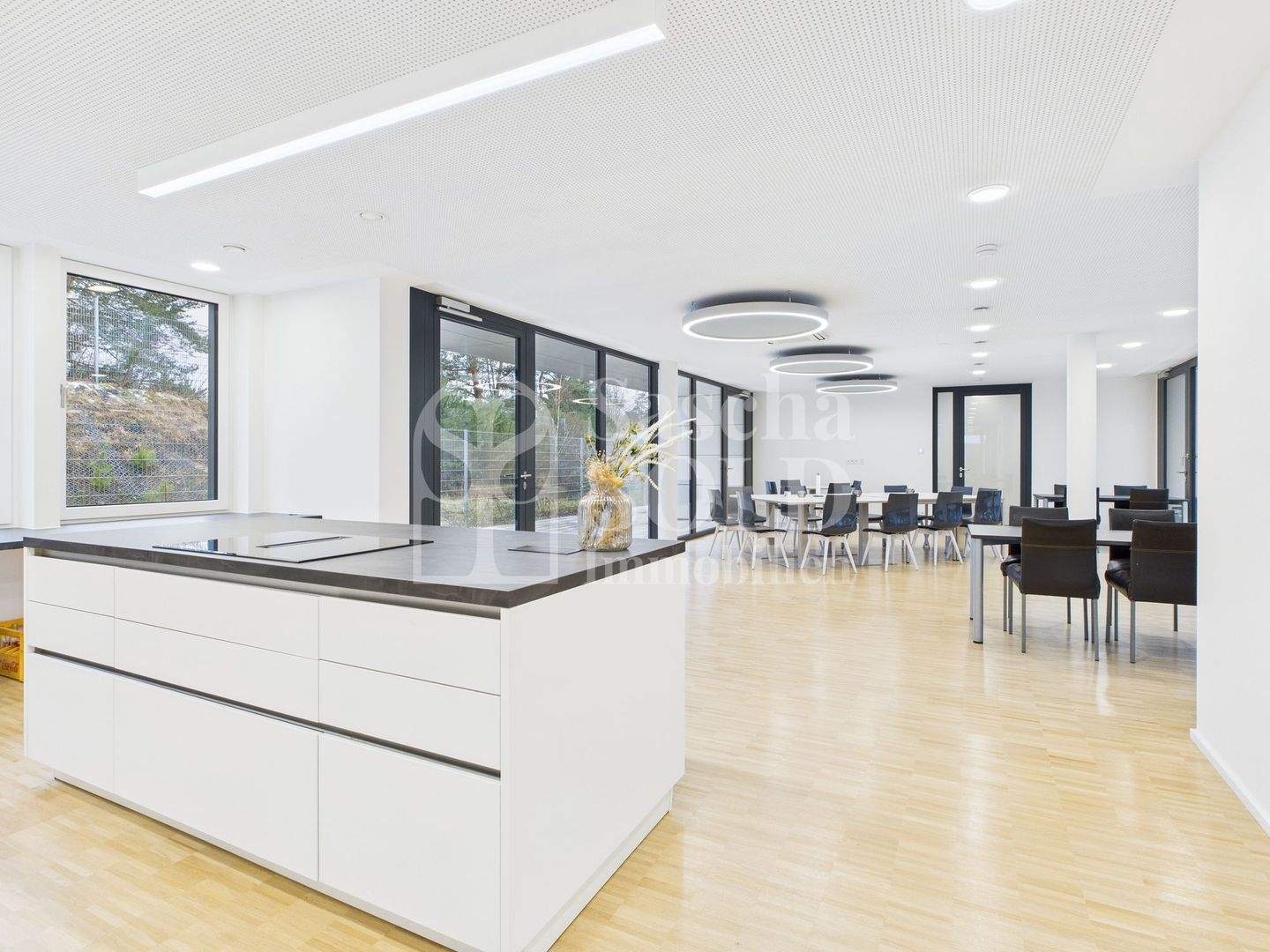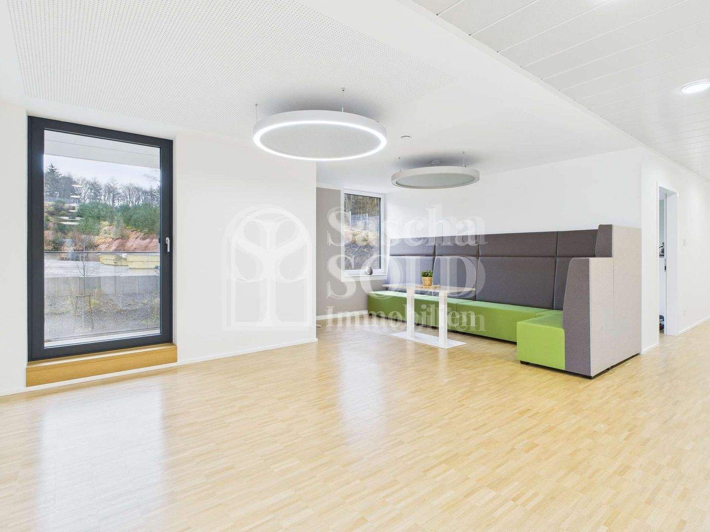 Im Erdgeschoss mit ca. 627 m² schafft das lichtdurchflutete Atrium im Eingangsbereich eine helle, einladende und repräsentative Atmosphäre. Hier befinden sich mehrere großzügige Büroräume sowie ein modern gestalteter Pausenbereich mit großer, voll ausgestatteter Küche als zentraler Treffpunkt für Mitarbeitende. Zusätzlich steht ein großzügiger Raum zur Verfügung, der sich flexibel als Besprechungs-, Schulungs- oder Tagungsraum nutzen lässt und somit auch für größere Teams oder externe Veranstaltungen ideale Voraussetzungen bietet. Die sanitären Anlagen sind getrennt für Damen und Herren ausgestattet.