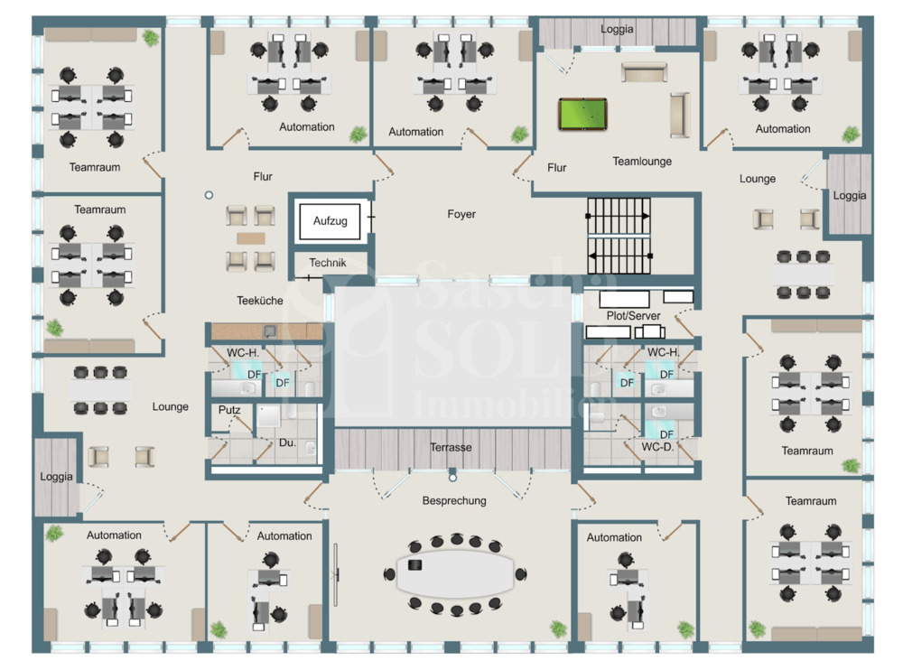 Das erste Obergeschoss mit ca. 562 m² bietet weitere Büroräume, kleinere Meetingzonen mit Küche sowie einen großen Besprechungsraum. Getrennte WC-Anlagen für Damen und Herren, teilweise mit Duschen, runden das Raumangebot ab.