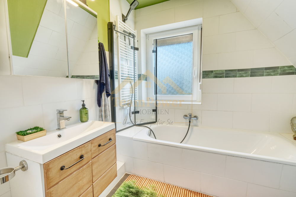 Im Obergeschoss befinden sich drei gemütliche Schlafzimmer, die flexibel als Kinder-, Gäste- oder Arbeitszimmer genutzt werden können. Das Tageslichtbad mit Badewanne präsentiert sich gepflegt und funktional. Ergänzt wird das Raumangebot durch ein separates Gäste-WC im Erdgeschoss.
