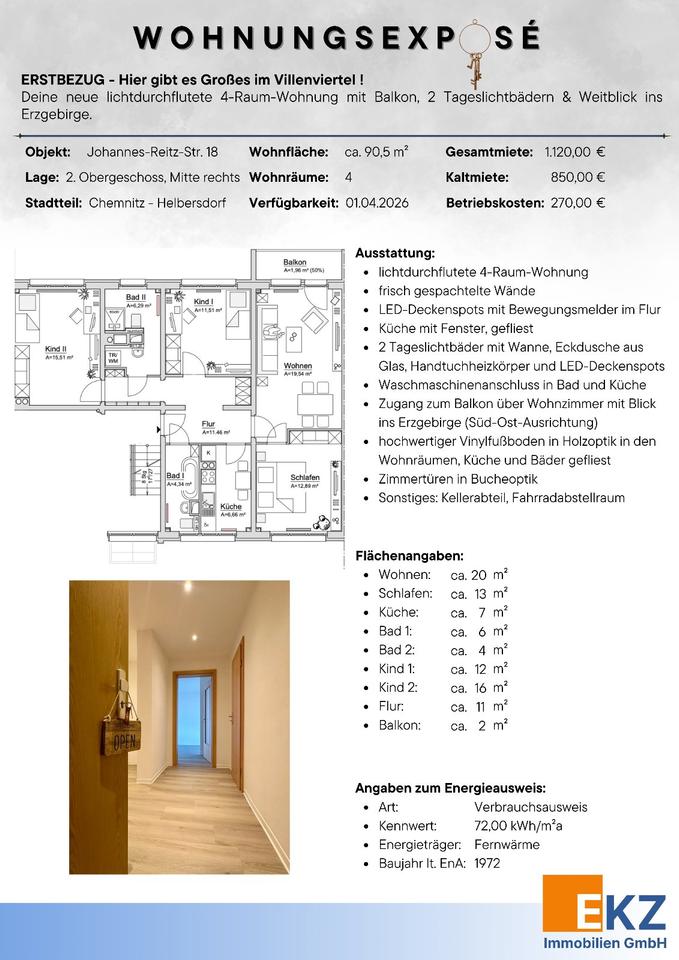 Sie befinden sich hier: ❝ ERSTBEZUG im Villenviertel - Deine neue lichtdurchflutete 4-Raum-Wohnung mit Balkon, 2 Tageslichtbädern & Weitblick ins Erzgebirge. ❞ in Chemnitz Helbersdorf - 3344647234-203-26080 | 1A-Immobilienmarkt.de