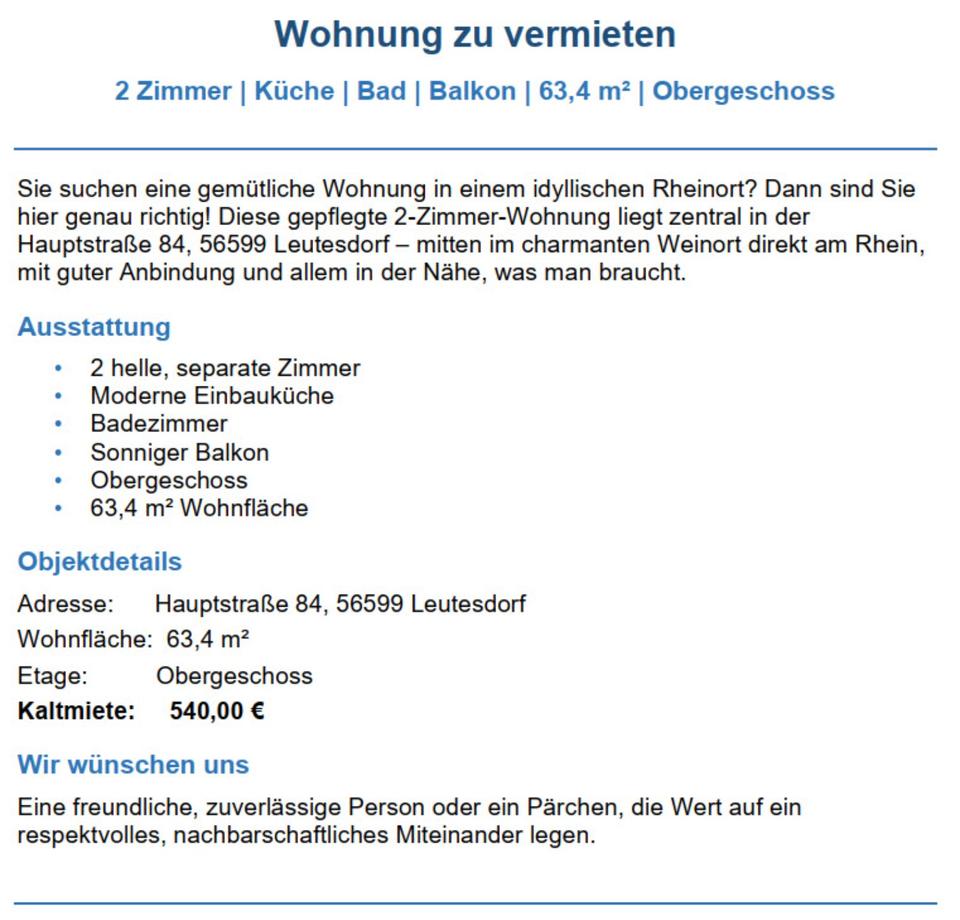 Sie befinden sich hier: Wohnung zu vermieten in 56599 Leutesdorf in Leutesdorf - 3346770613-203-4940 | 1A-Immobilienmarkt.de
