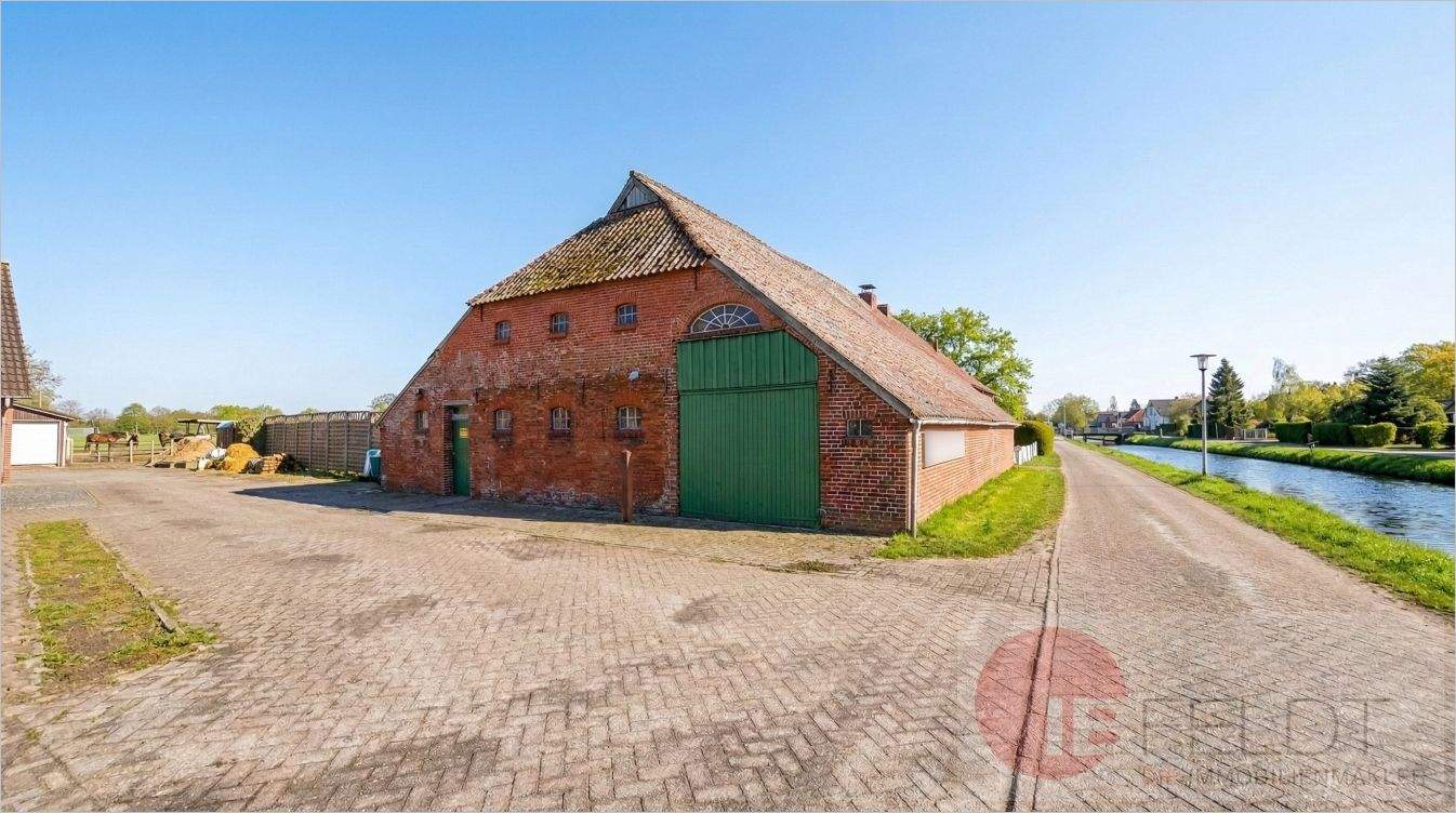 Außenansicht - Kleinod zum Wachküssen mit Idylle pur: Fehnhaus direkt am Wasser mit Scheune, Garage & großem Garten