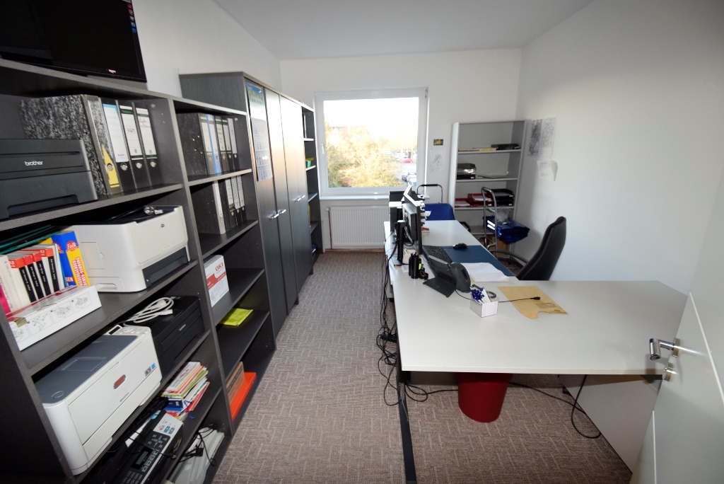 Die Halle grenzt direkt an das Bürogebäude und es gibt bereits 2 Zugänge. Sollte es erforderlich sein, so können Sie sowohl im EG als auch im OG eine Teilfläche der Halle zum Büro hinzu mieten.