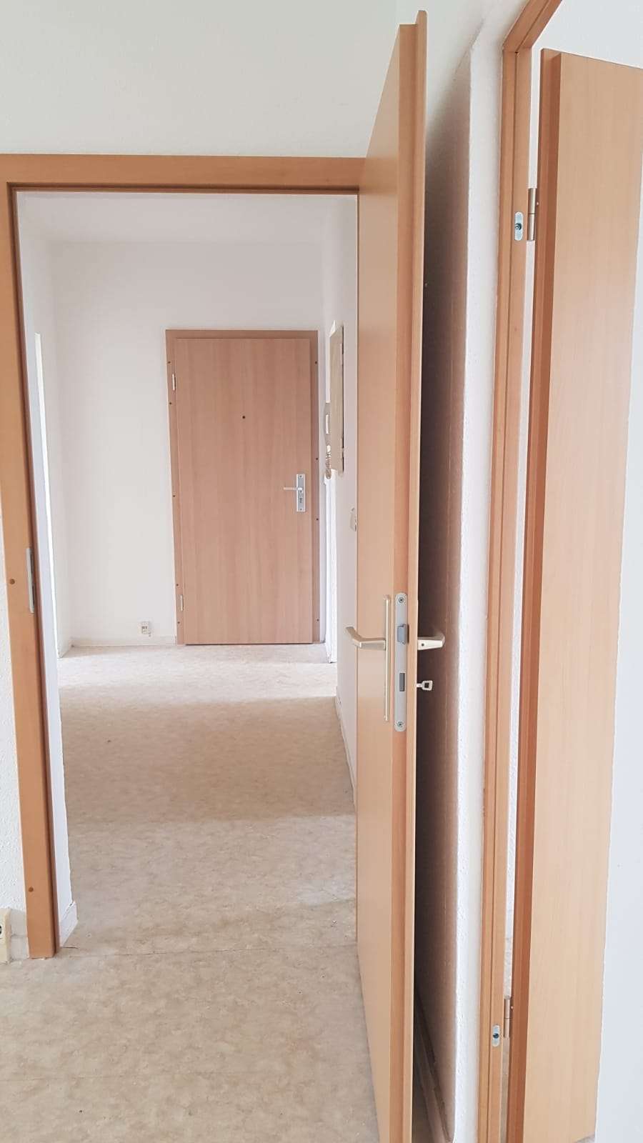 Die im 3.OG links gelegene 4 Zimmer Wohnung verfügt über einen zentralen Flur von dem aus das Kinderzimmer und das Wohnzimmer, sowie Küche und Bad abgehen. Eine neue Einbauküche ist optional und kann vor Einzug eingebaut werden. Bad mit Badewanne und Fenster. Das großzügige Wohnzimmer mit über 20m² Fläche besitzt einen Balkon, der sich über die gesamte Breite des Wohnzimmers erstreckt. Von hier geht auch das Schlafzimmer ab. Der Fußboden ist mit PVC/Laminat versehen. Die Küche ist mit Fliesenspiegel und pflegeleichtem Kunststoffboden ausgestattet Eine Einbauküche ist im Mietpreis enthalten. Die Wohnung hat eine Wechselsprechanlage, TV und Telefon Anschluss. Zur Wohnung gehört ein geräumiger, gepflegter Kellerraum.
