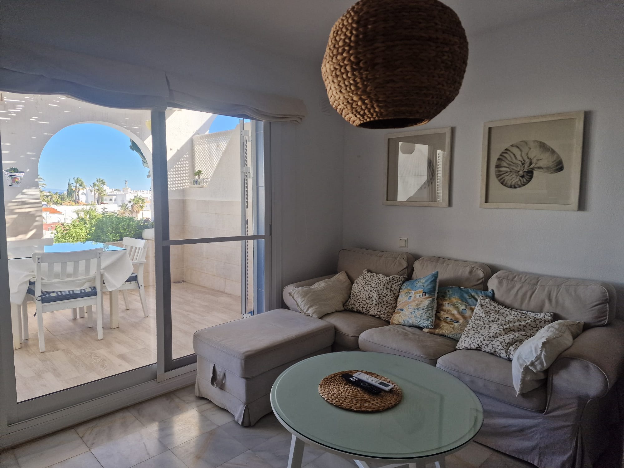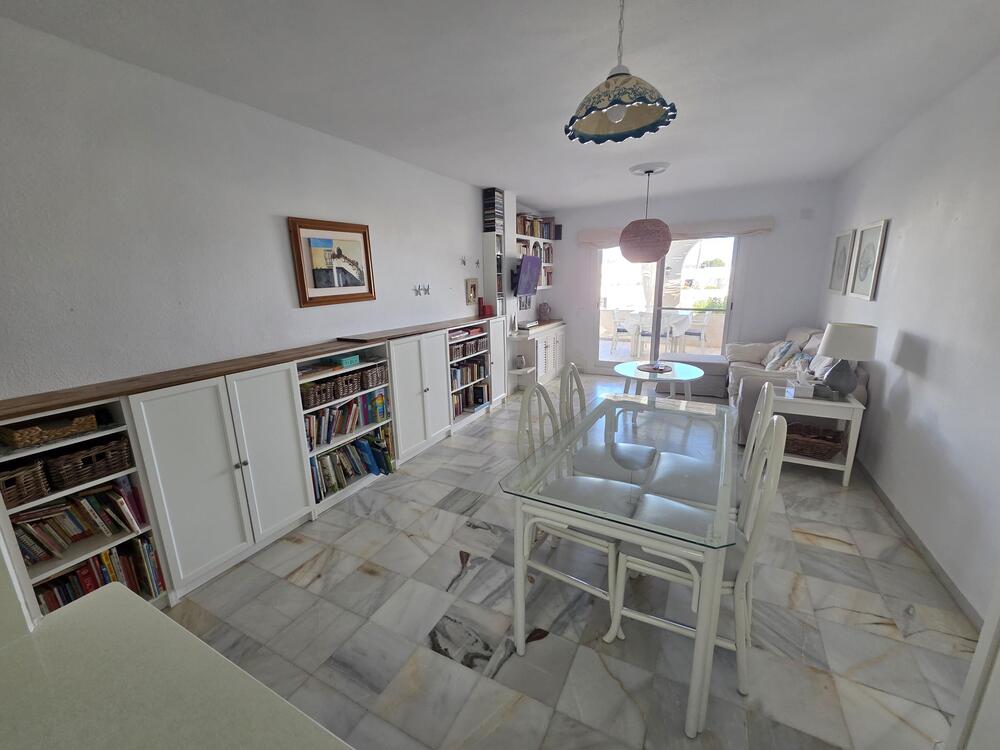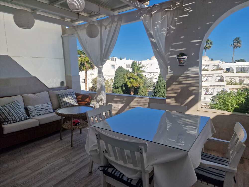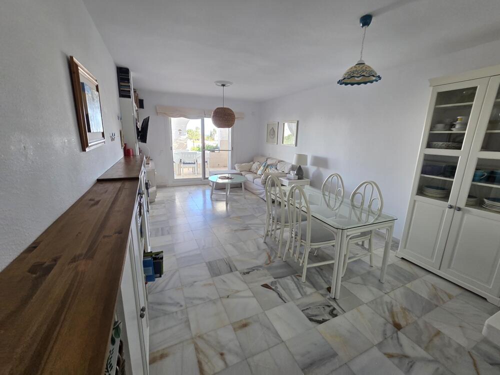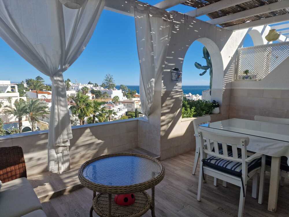 Zu vermieten: Geräumiges Penthouse-Apartment mit 2 Schlafzimmern, 1 Badezimmer, Terrasse mit fantastischem Meerblick, voll ausgestatteter Küche, Gemeinschaftspool, privatem Tiefgaragenstellplatz, direkt am schönsten Strand von Mojácar.