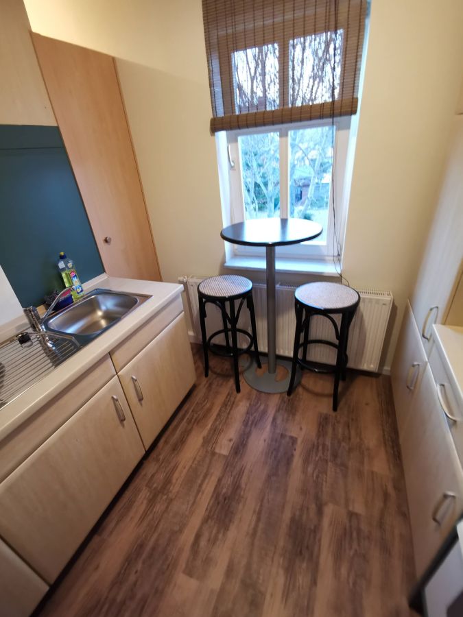 Die Wohnung ist voll möbliert, wie Sie auf den Bildern sehen können. Schrank, Bett und Schreibtisch befinden sich im Wohn-/Schlafbereich. Ebenso Fernseher und Arbeitsplatz. Die Küche ist komplett mit Herd und Kühlschrank sowie Bartisch und Barhocker ausgestattet. Kochtöpfe, Geschirr, Gläser und Besteck für den täglichen Bedarf sind in der Küche vorhanden. Das geflieste Bad hat eine Badewanne, ein Waschbecken sowie ein WC.