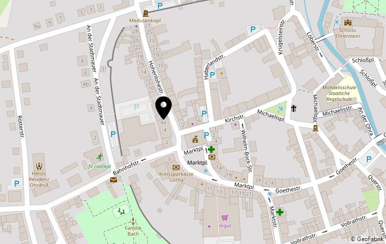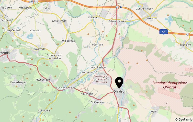 Ohrdruf ist mit seinen rd. 6.000 Einwohnern ein kleines Städtchen südlich der Autobahn A4 / AS Gotha und zugleich ein Tor in den Thür. Wald. Eine komplette Infrastruktur (Behörde, Medizin, Schule, Einkauf, Erholung) macht das Leben hier angenehm. 1599 verlegten die Grafen von Gleichen ihren Wohnsitz nach Ohrdruf in das noch heute zu besichtigende Schloss Ehrenstein.