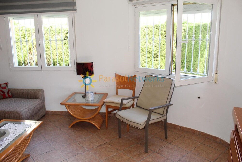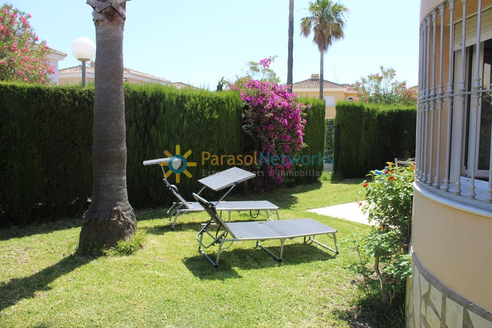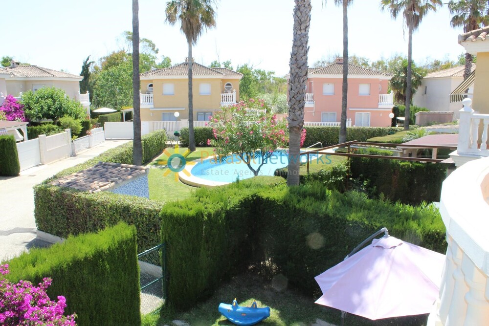 Saisonvermietung Diese schöne Villa mit Gemeinschaftspool befindet sich in der bekannten Urbanisation Oliva Nova Golf. Es hat ein Grundstück von ca. 250 m2 und darauf steht eine Konstruktion von ca. 95 m2 verteilt in: Im Erdgeschoss befinden sich ein großes Wohnzimmer, eine Küche und ein Bad. Das Obergeschoss verfügt über zwei Doppelzimmer mit einer Terrasse und einem Badezimmer. Draußen gibt es einen schönen Garten, zwei Terrassen, Grill und Parkplatz für ein Fahrzeug. Es wird nur von september bis JUNI vermietet.