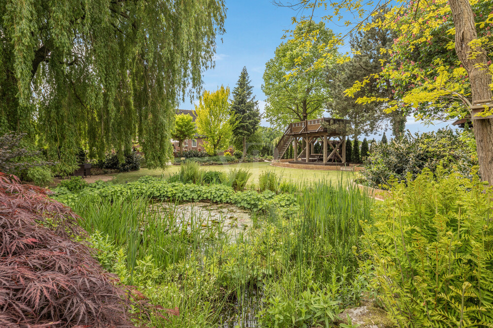 Gartenbereich: - 2 überdachte Terrassenplätze - 1 Terrasse als schöner Freiplatz - ummauerte Terrasse mit integriertem Außenpool - Gartensauna mit Profi-Außenwanddusche - kleine Strandanlage mit Terrasse - Holzaussichtsplateau mit Whirlpool inkl. Sichtschutz für Privatsphäre - Teichanlage mit Außenbepflanzung - Schöner Baumbestand auf dem Grundstück