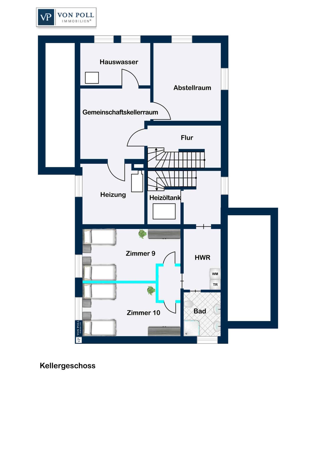 Geplante Maßnahmen für die Umsetzung, im Grundriss in hellblau ersichtlich: - 1 weiteres Zimmer im Erdgeschoss und Dachgeschoss - 2 weitere Zimmer im Kellergeschoss - 2 zusätzliche Duschen und WC im Erdgeschoss und Spitzboden - Küchenzeile im Dachgeschoss