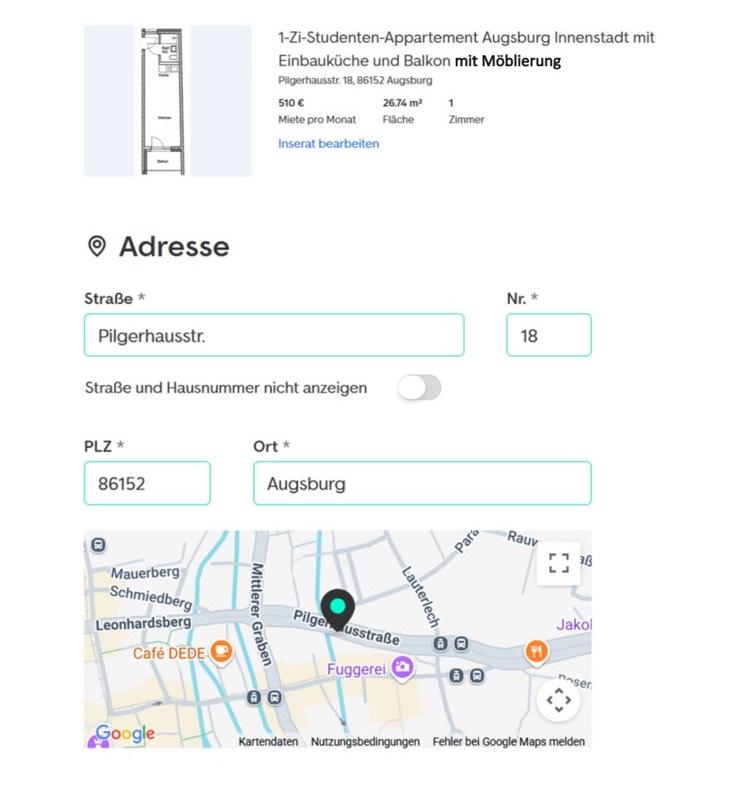 Sie befinden sich hier: 1 Zimmer Studenten Appartement möbeliert mit Süd-Loggia in Augsburg Innenstadt - 3351936932-203-7526 | 1A-Immobilienmarkt.de