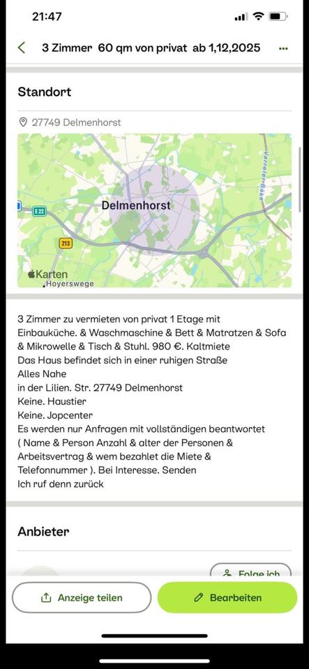 Sie befinden sich hier: 3 Zimmer von privat zu vermieten ab 1,3,2026 in Delmenhorst - 3352525794-203-2470 | 1A-Immobilienmarkt.de