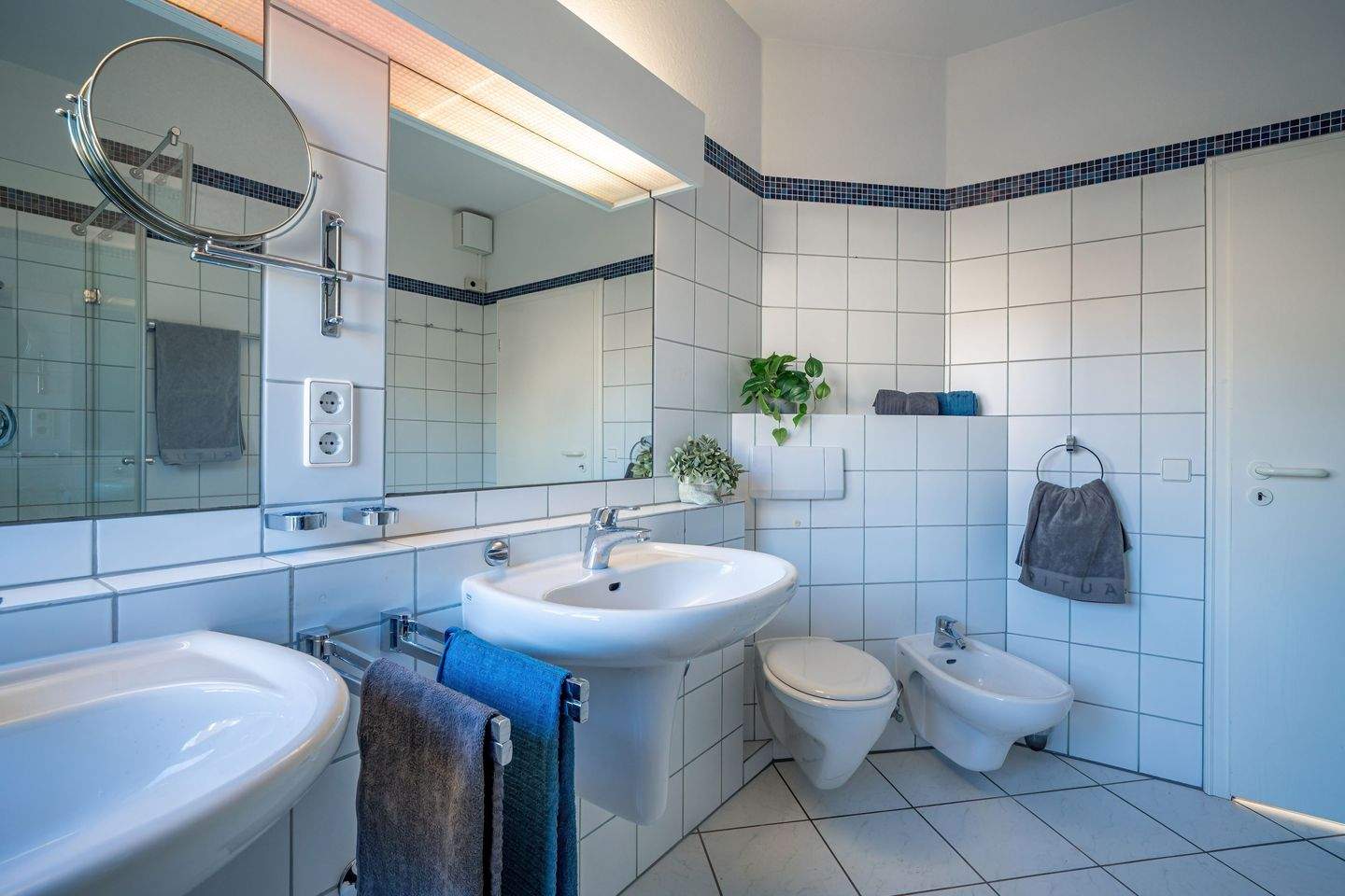 • Der Raum ist klassisch weiß gefliest und mit zwei Waschbecken ausgestattet. -
