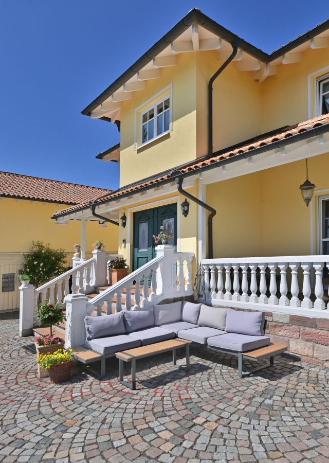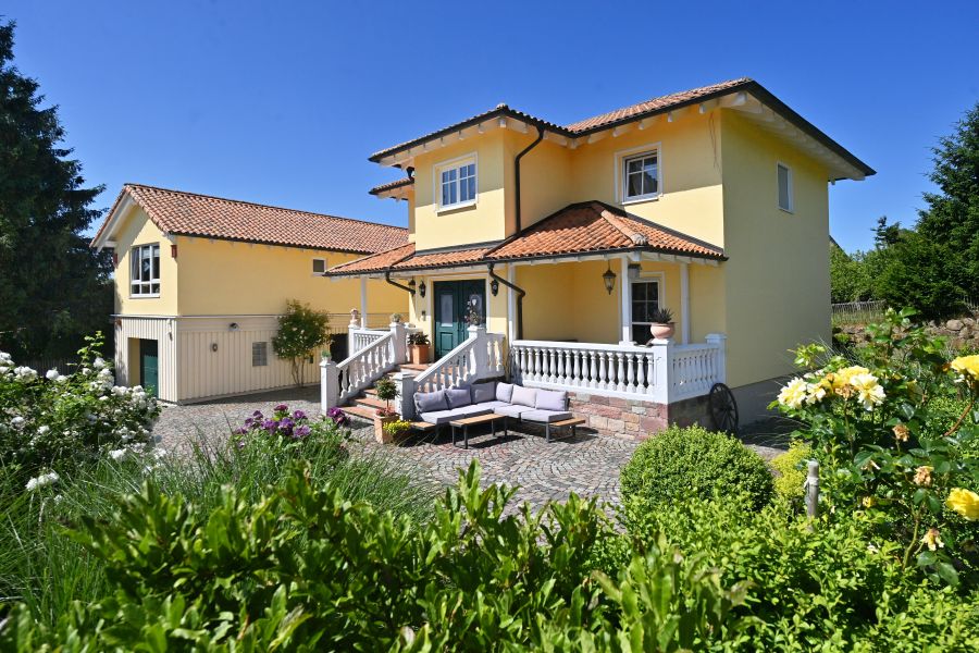 Wohnen wie im Urlaub ! Sie wünschen sich ein außergewöhnliches Anwesen mit vielen Annehmlichkeiten und außergewöhnlichem Charakter? Diese im Jahr 2004 erbaute Villa Im Toskana Stil mit Nebengebäude liegt Traumhaft idyllisch und eingebettet in eine herrlich grüne Umgebung mit ca. 330 m² Wohnfläche auf einem über 4550 m² großen parkähnlichen Grundstück. Das facettenreiche Anwesen mit seiner authentischen Architektur, der unverwechselbaren Ausstattung und der exklusiven Außenanlage bezaubert auf Anhieb. Es besteht aus zwei Gebäuden, das ca. 4.550 m² große und vollständig eingezäunte Grundstück wurde mit viel Liebe zum Detail gestaltet. Die Lage mit einer unverbaubaren Aussicht auf Hessens höchstem Berg, der Wasserkuppe (950m) sowie die umliegenden Berge und Wälder ist einzigartig. Der große und gepflegte Garten bietet im hinteren Teil einen großen Naturteich mit Holzterrasse welche zum Verweilen einlädt, hier befindet sich auch ein großer Obstbaumbestand sowie ein Gewächshaus. Im vorderen Teil des Gartens befindet sich ein gemütlicher Pavillion mit Sandsteinmauer. Hier kann man gesellige Abende mit der Familie und Freunden verbringen. Wenn sie davon Träumen an einem Ort zu wohnen an welchem die Zeit still steht dann ist dieses Anwesen das richtige. Nutzungsmöglichkeiten: Mehrgenerationenwohnen Im Obergeschoss des Nebengebäudes lässt sich ein kleines Appartement mit Schlafraum und Wohn- Küche integrieren, eine perfekte Lösung für Familien, welche mit mehreren Generationen auf einem Grundstück leben möchten, aber dennoch Wert auf einen individuellen Rückzugsort legen. Im Erdgeschoss befindet sich ein kleiner Partyraum mit gemauertem Holzbackofen. Ein weiterer Raum beherbergt die Sauna, von der Holzterrasse davor hat man Zugang zum hinteren Garten bzw. den Teich. Wohnen und Arbeiten Das Nebengebäude kann auch als Atelier, Büro, Fitness- Wellness Bereich oder aber als Home-Office dienen. Vermietung Das Nebengebäude könnte zur Vermietung oder als Ferienwohnung genutzt werden um zusätzliche Einnahmen zu generieren. Der Garten ist teilbar, bzw. durch einen Zaun vom vorderen zum hinteren Teil getrennt.