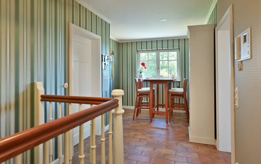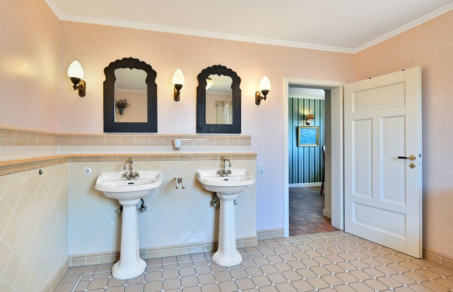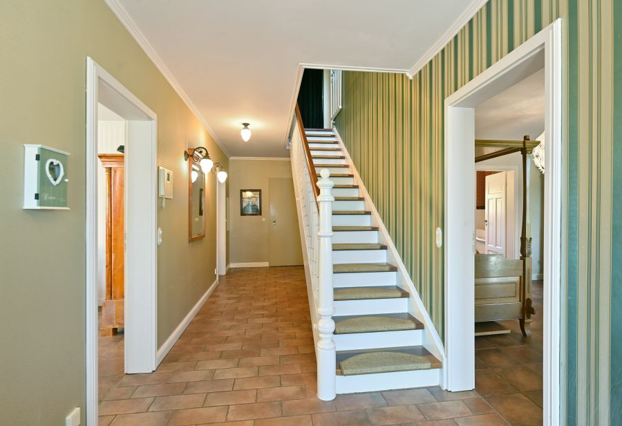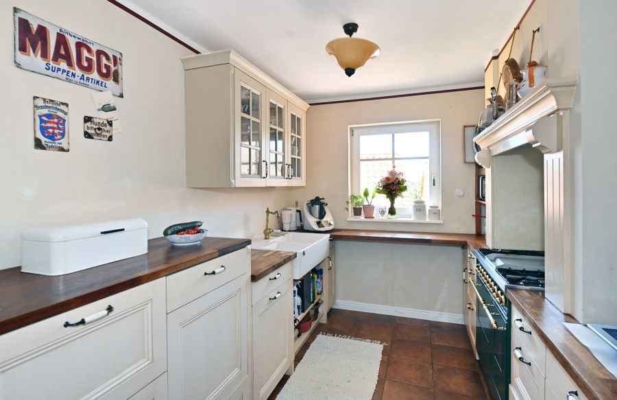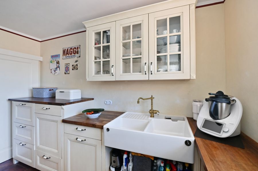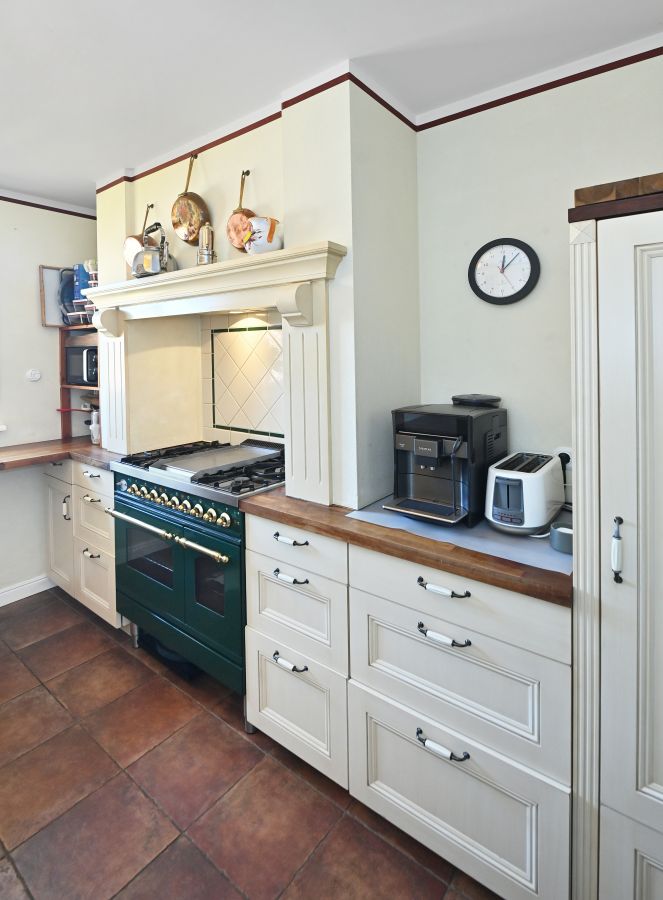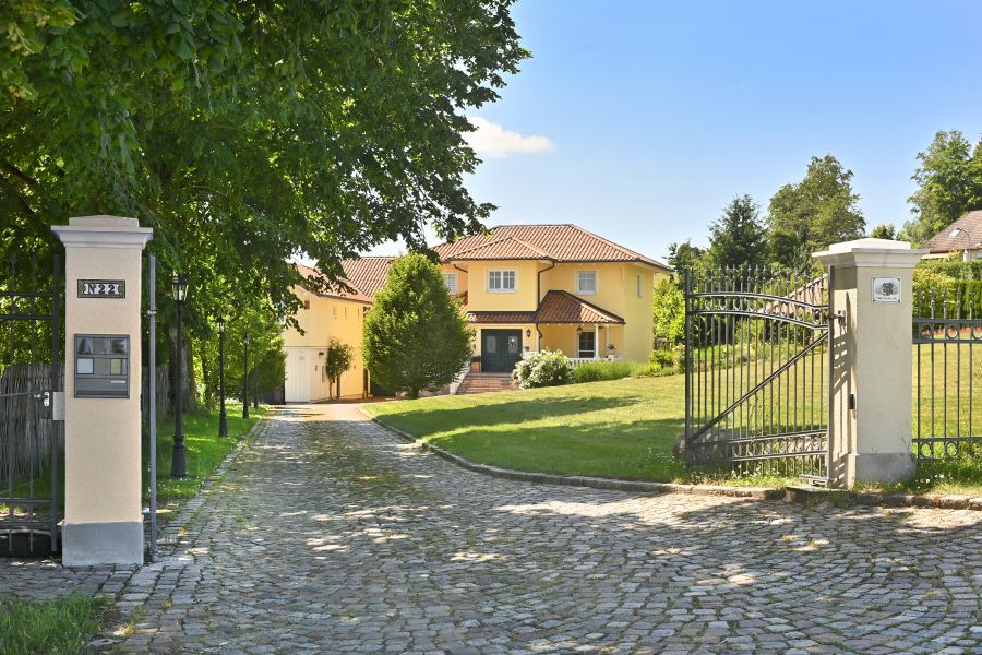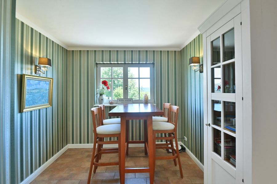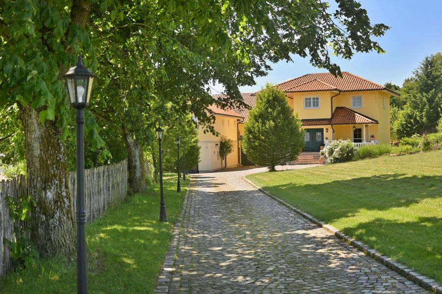 In Bezug auf die sehr wertige Ausstattung wurde an alles gedacht, was für ein optimales, gehobenes Wohnen erforderlich ist. * Zeitloses Design im Toscana Stil * Tejas Borja Dacheindeckung * Vollwärmeschutz mit Fassadendämmplatten * Meranti Holzfenster (teilweise Verbunds-Sicherheitsglas) mit echten Sprossen * Rollos elektrisch * Treppenaufgang zur Haustüre in echtem Terracotta * Hochwertige Fliessenböden * BERKER 1930 Schalter und Steckdosen * Einbauküche mit großem ILVE Herd und Echtholz Arbeitsflächen * Lampen der BERLINER MESSSING Manufaktur * großer JOTUL Kaminofen aus Gusseisen * Einbauschränke im Ankleidezimmer * Großer Balkon im Wohnbereich, Richtung Süden * Holzterrasse nicht einsehbar vor der Sauna * 14m² direkt an den Teich angrenzende Terrasse * Balkone vor der den Zimmern im EG links und rechts * Separate Zugänge zu beiden Gebäuden * Garage mit 2 Stellplätzen mit breitem, elektrischen (Sektional) Rolltor sowie Bereich für Hauswirtschaft im Haupthaus * Separate Garage für Nebengebäude (für Kleinwagen) * Große Tenne als weitere Parkmöglichkeit für Fahrzeuge oder ähnliches * 2 Pferdeboxen * Teich mit einer Größe von ca. 18x10 Meter und max. 2, 80m Tiefe * Sandsteinkeller mit eigenem Brunnen * Gewächshaus und große Streuobstwiese * Weitere Garage im hinteren Teil des Gartens als Holzlager und Geräteschuppen nutzbar * Vorbereitung Kabel für Solar / PV Anlage