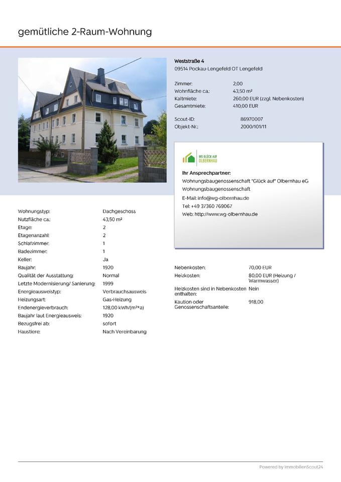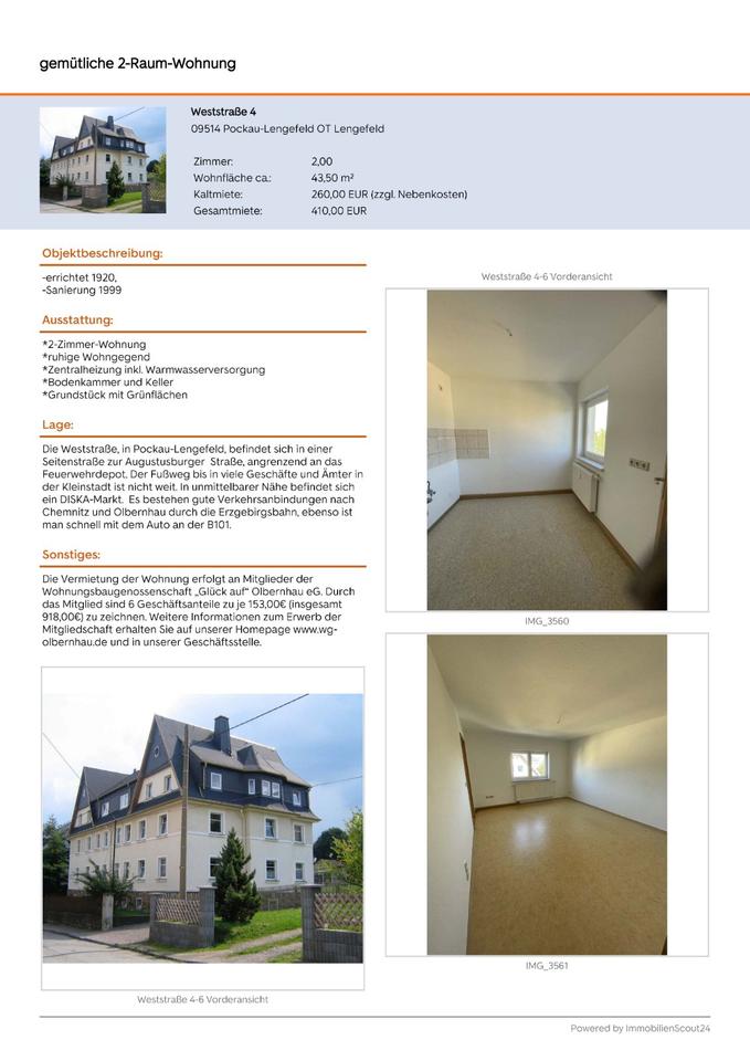 Sie befinden sich hier: 2Raum Wohnung in ruhiger Lage von Lengefeld zu vermieten in Pockau-Lengefeld - 3299467396-203-4052 | 1A-Immobilienmarkt.de