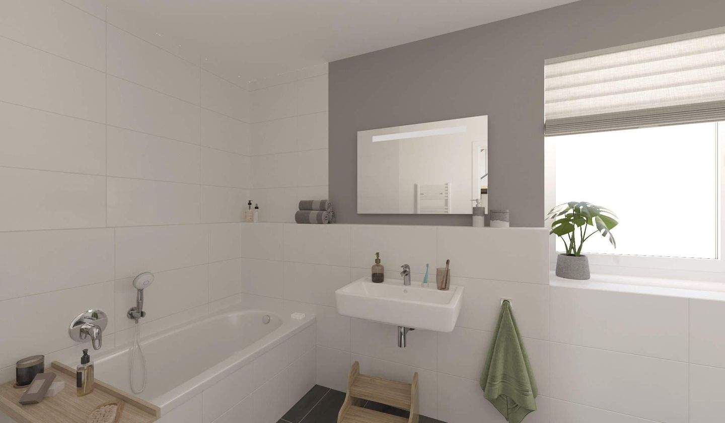 • Modern gefliestes Badezimmer mit Badewanne -