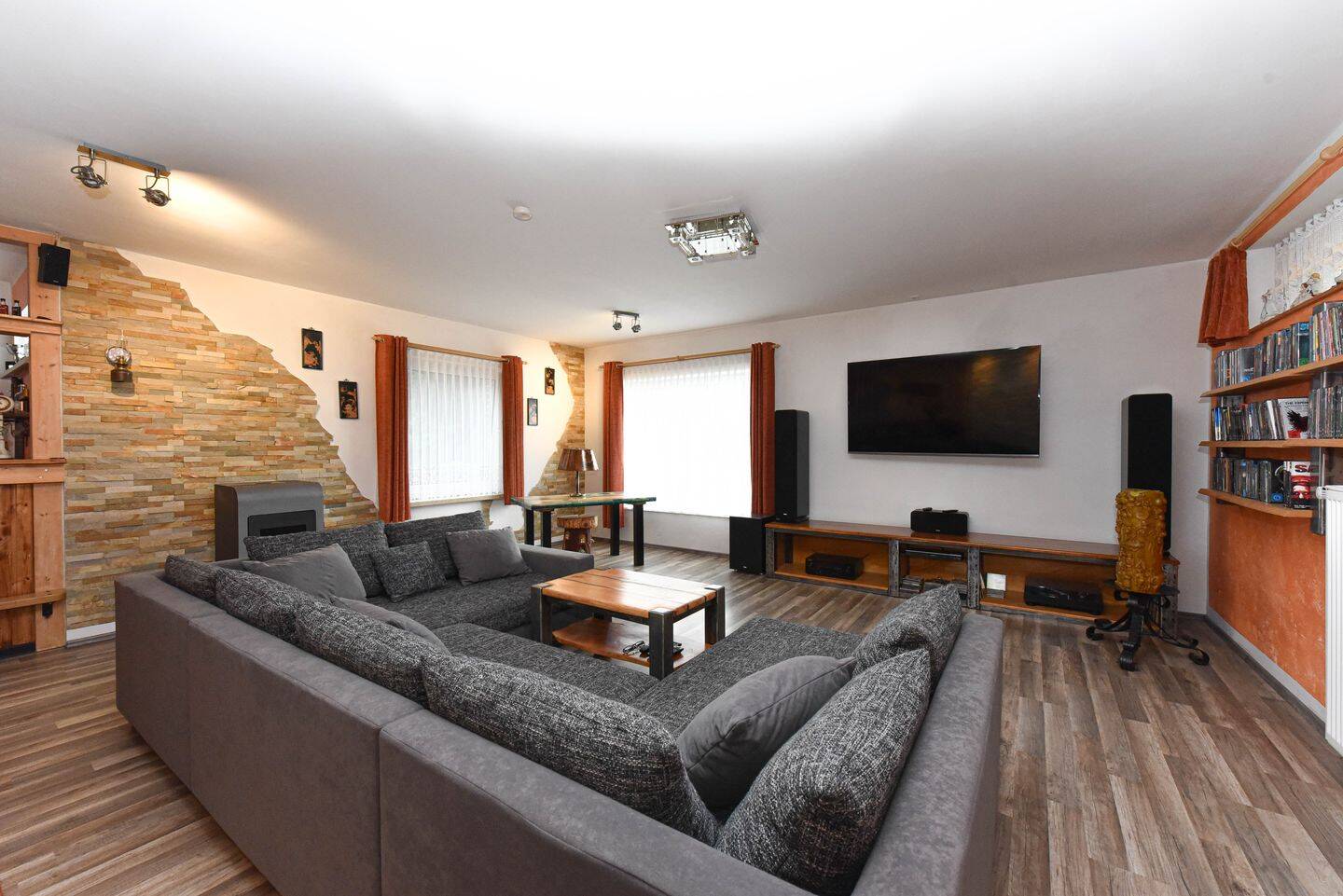 • offener Wohn- und Essbereich mit dekorativen Steinwänden -